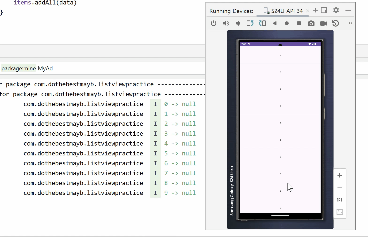 ListView가 더 이상 보이지 않는 View를 바로 재활용한다는 사실을 확인하기 위해 ListView에 사용할 BaseAdapter getView 함수에서 로그를 찍도록 설정했다.