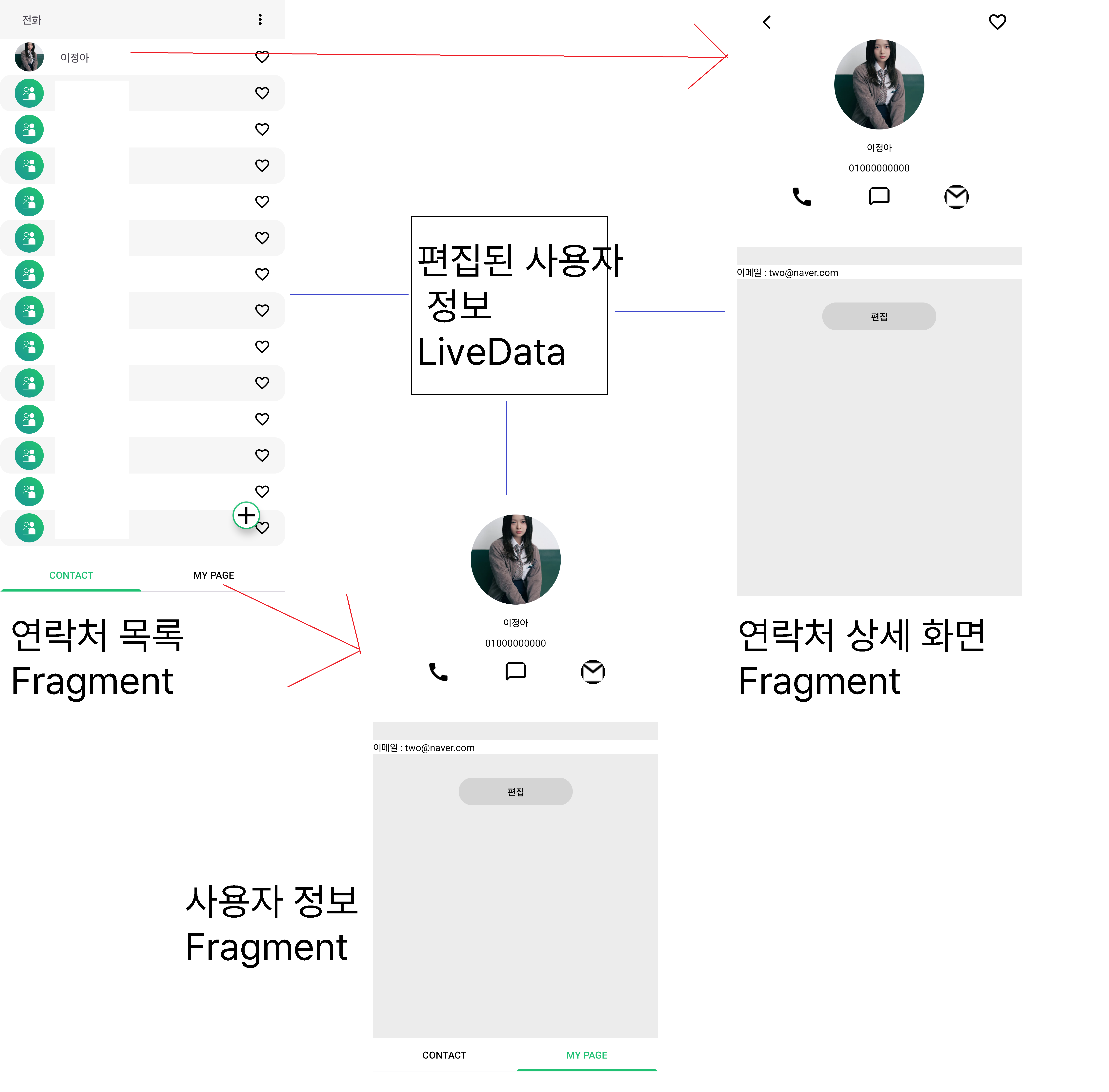 문제가 된 부분은 상세 정보 화면으로 표시하는 연락처 정보가 사용자인 경우입니다. 연락처를 표시하는 Fragment에서 상세 정보 화면 Fragment를 띄울 때, replace가 아닌 add로 구현했습니다. 연락처 목록 중 사용자 자신의 정보에 진입하는 경우, LiveData를 세 곳에서 관찰하는 상황이 발생합니다.