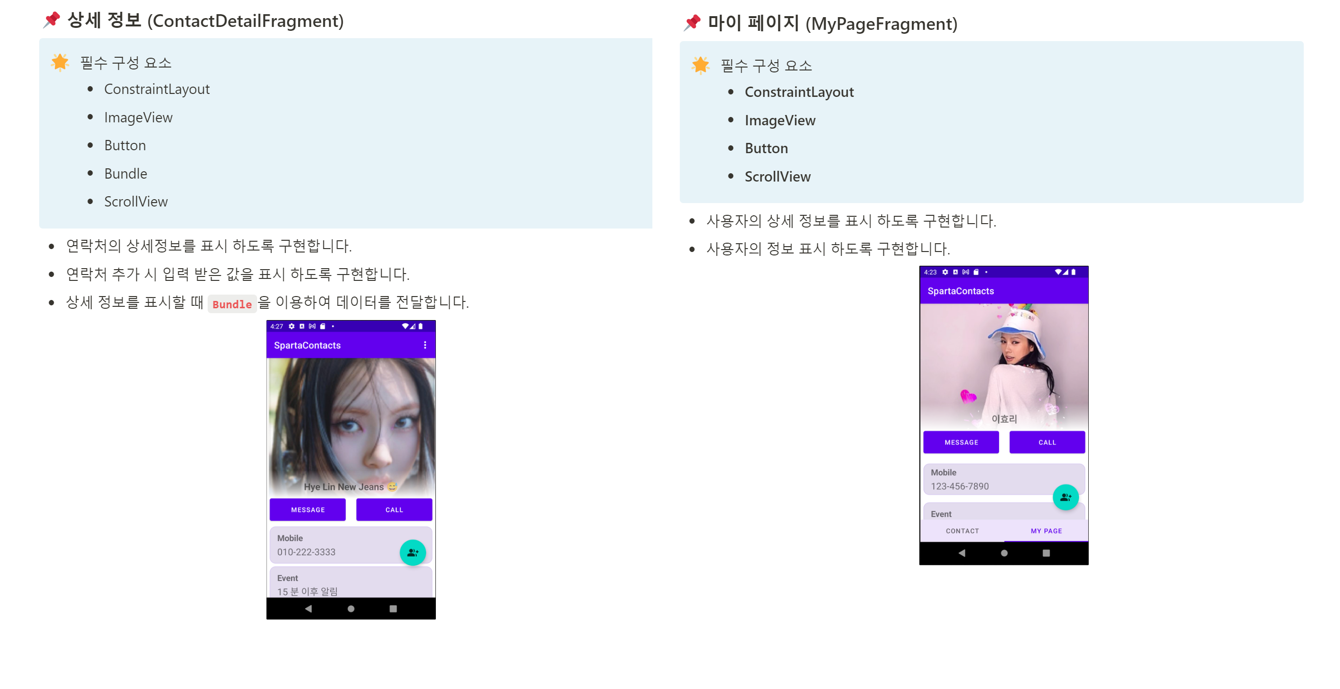 아래의 구현 조건을 보고 상세 정보 화면과 마이 페이지 UI가 비슷하기 때문에 동일한 Fragment로 구현하기로 했습니다.