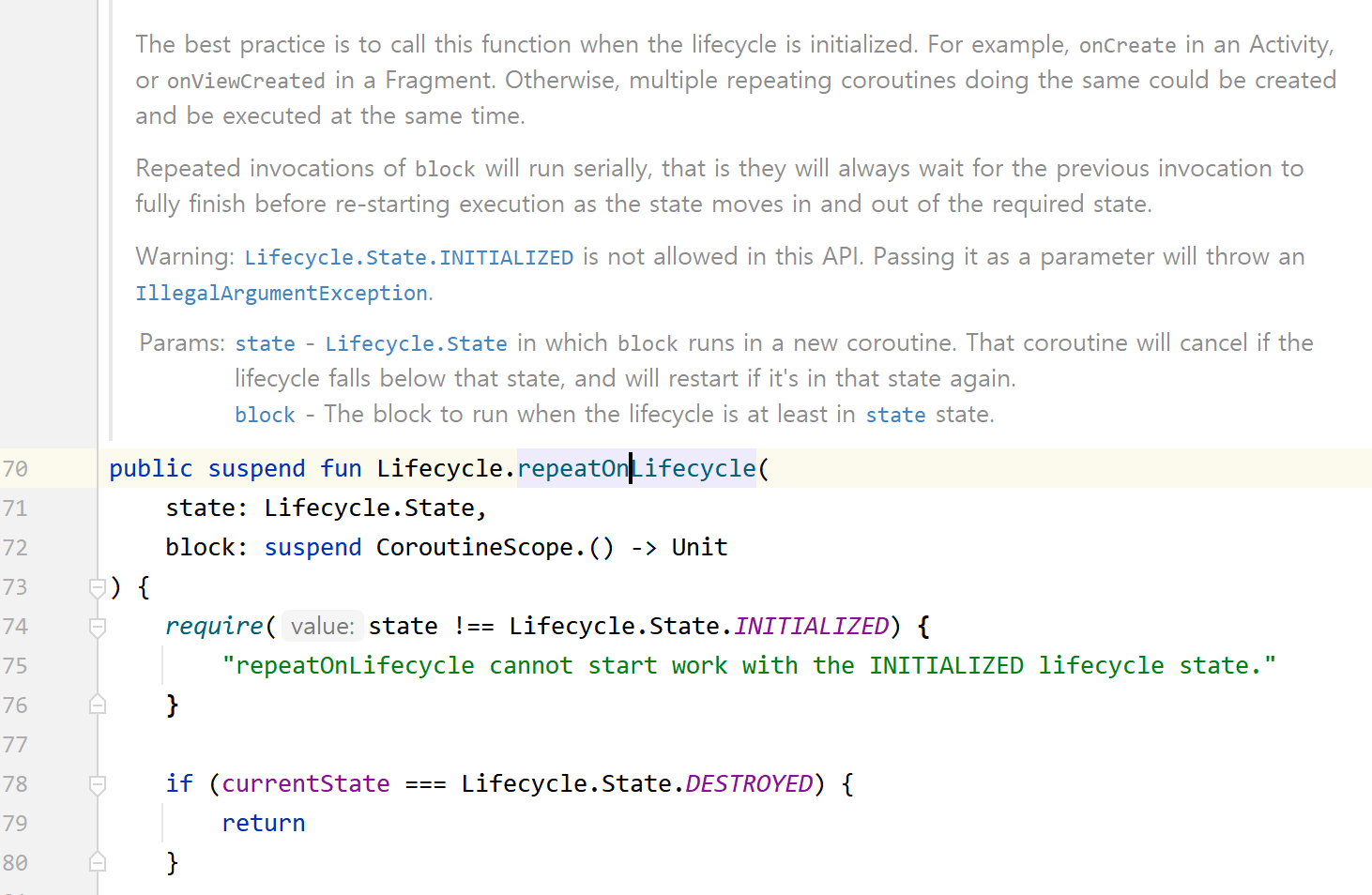 LifecycleOwner의 확장 함수로, LifecycleOwner의 lifecycle이 최소한 파라미터로 입력한 Lifecycle 일 때, 코루틴 람다 블록이 실행됩니다. 지정한 Lifecycle이 아니면 코루틴이 취소됩니다.