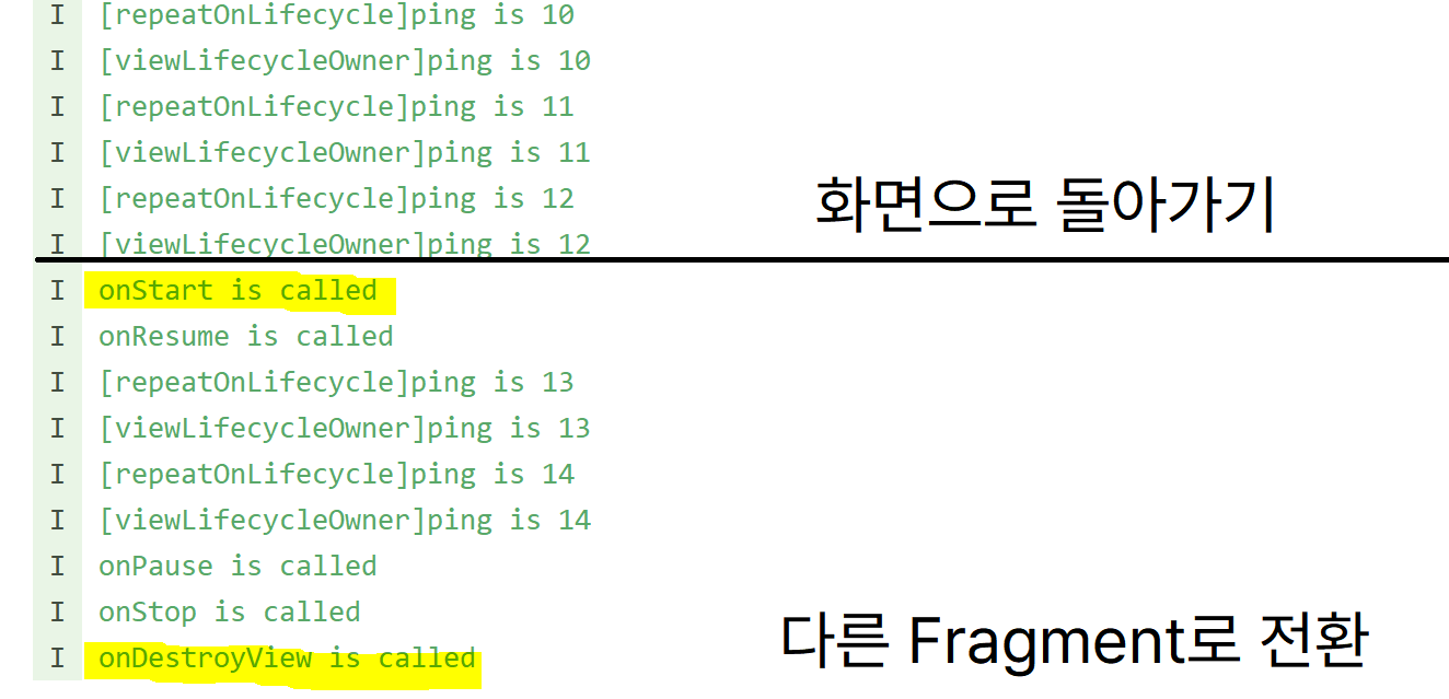 따라서 STARTED 이후의 Lifecycle에 따른 동작은 Fragment view의 LifecycleOwner를 사용하든, Fragment의 LifecycleOwner를 사용하든 동일합니다.