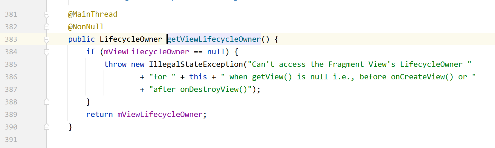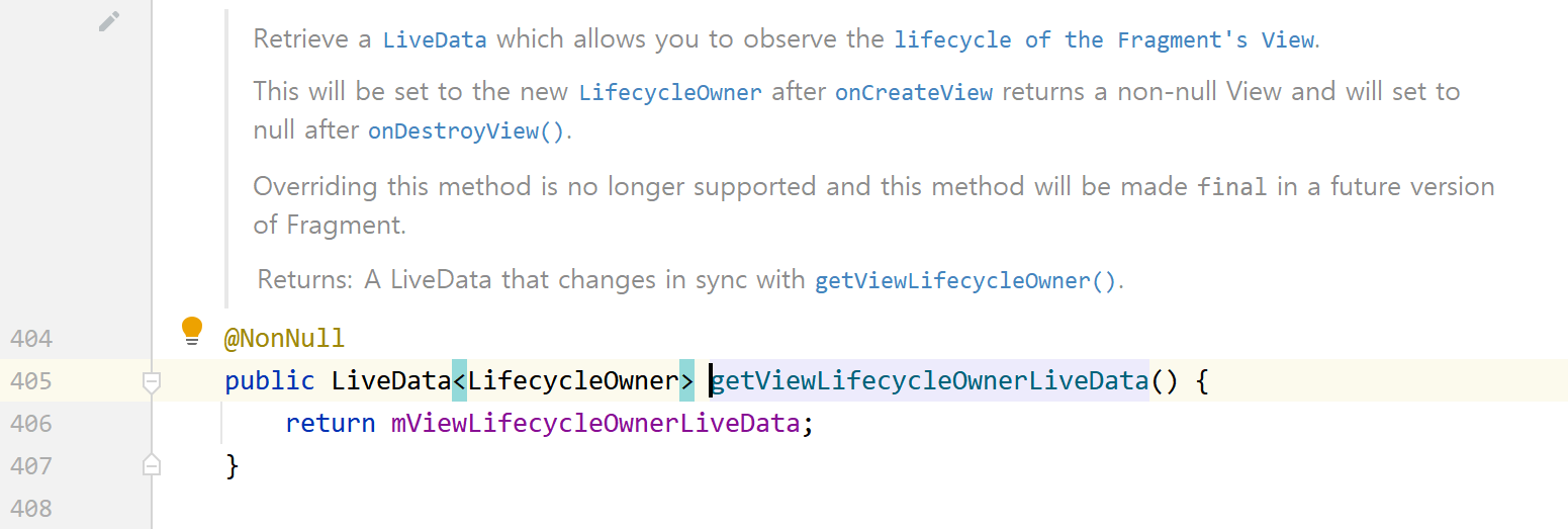 getViewLifecycleOwnerLiveData 함수를 통해 Fragment view의 Lifecycle이 변경되는 것을 관찰할 수 있는 LiveData를 반환 받을 수 있습니다.