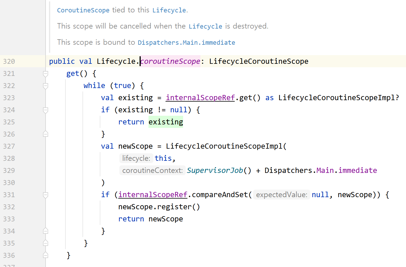 while 문으로 되어 있는 이유는 lifecycleScope을 두 개 이상의 쓰레드가 동시에 접근해서 newScope이 2개 이상 생성된 경우, compareAndSet 함수를 늦게 호출한 함수는 newScope을 반환 받을 수 없기 때문입니다.