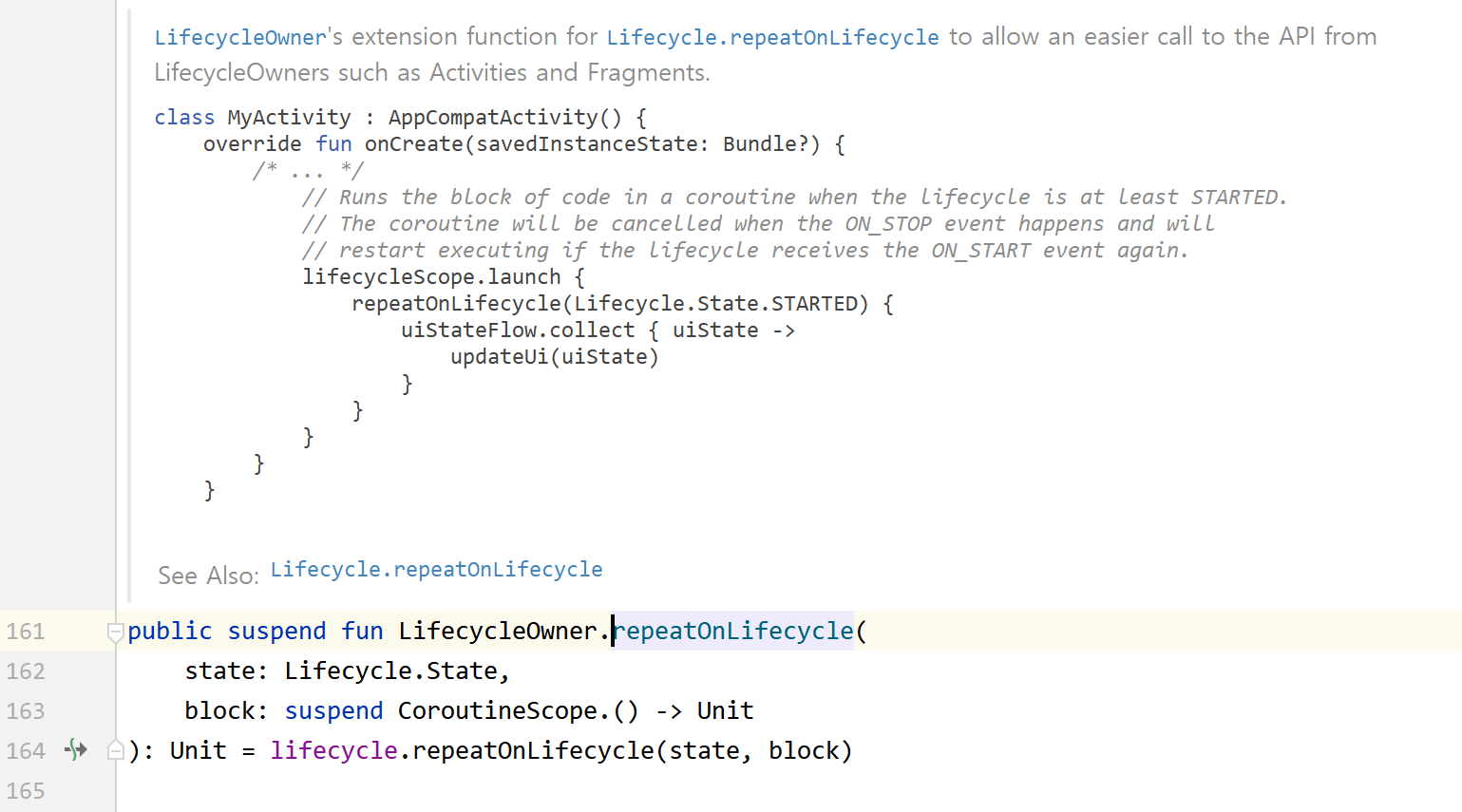 내부적으로 LifecycleOwner가 가지고 있는 Lifecycle의 repeatOnLifecycle 확장 함수를 호출하고 있습니다.