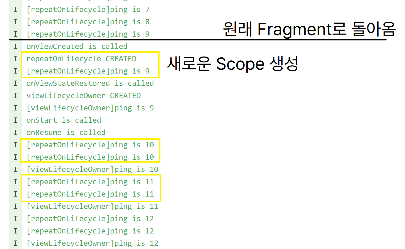 원래 화면으로 돌아올 경우, 기존에 생성했던 코루틴 Scope 뿐만 아니라, 새로운 코루틴 Scope가 생성되었기 때문에 관찰이 2번 되는 것을 볼 수 있습니다.