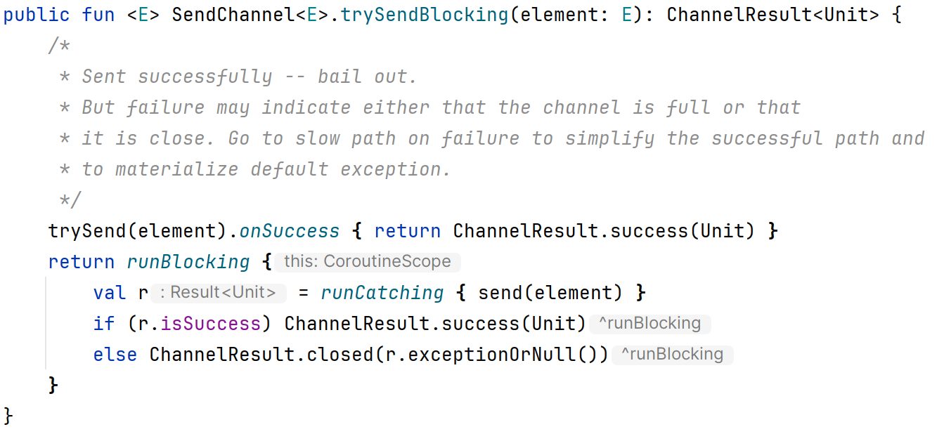 ChannelFlow의 또 다른 장점은 non-suspend 함수인 trySend를 이용할 수 있다는 점입니다. trySend는 버퍼가 꽉차서 emit에 실패하더라도 기다리지 않고 데이터를 버립니다.