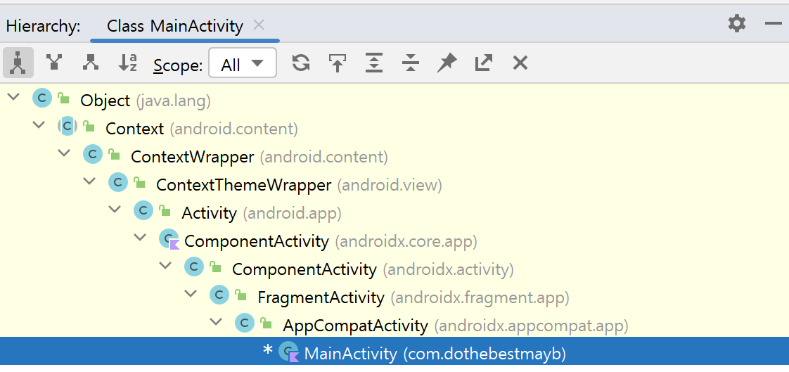 activity의 lifecycleScope을 이용해 코루틴으로 돌려야겠다고 생각했다. lifecycleScope을 입력하는데, no reference 라고 나온다. Activity가 상속하는 클래스를 확인했다. Activity라고 적혀 있었다. 예전에 Ctrl+H를 눌러서 Activity의 상속 관계를 확인했던 기억이 났고, Activity는 분명히 아니었던 것 같다.