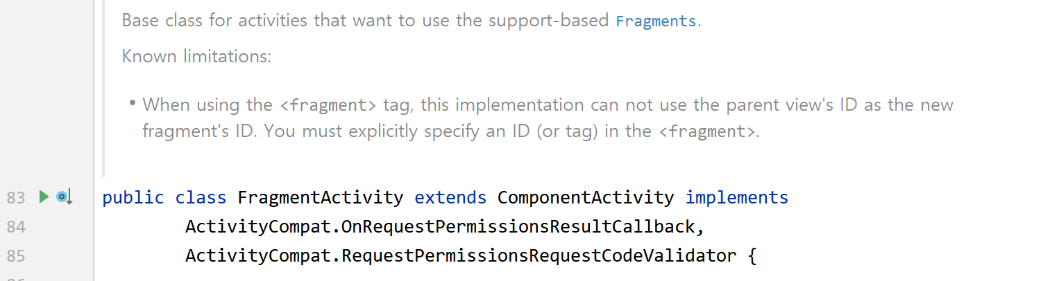 Fragment를 가지는 Fragment를 SDK 버전이 낮은 Fragment에서 사용하기 위함이라고 하는데 잘 와닿지 않는다. 나중에 FragmentActivity 관련 문제를 직면하면 별도로 글을 작성해보겠다.