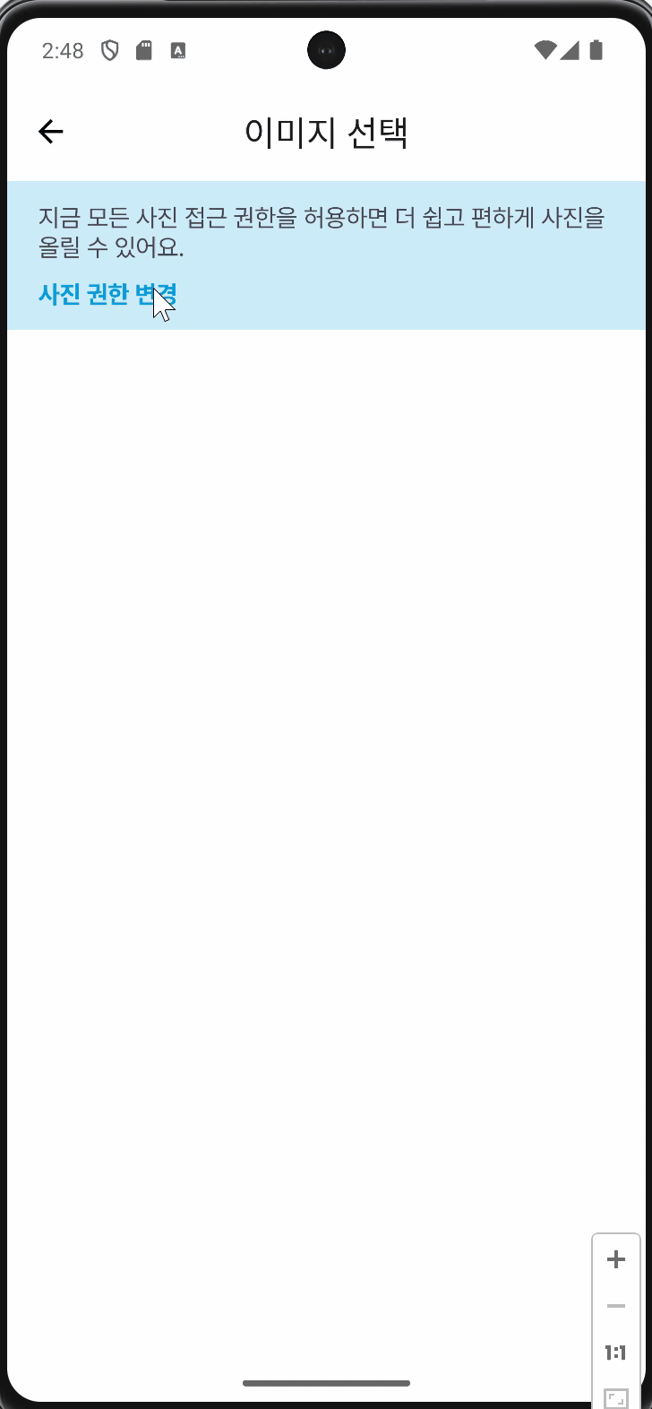 상단의 사진 권한 변경 영역을 클릭하면 Navigation Action을 이용해 ModalBottomSheetFragment가 실행되어 ModalBottomSheet가 보이도록 설정했습니다.