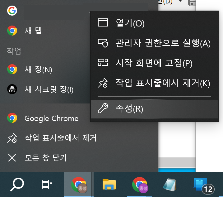 이 문제는 바로가기 속성 값을 수정함으로써 해결할 수 있다. 작업 표시줄의 기본 프로필 크롬 아이콘을 오른쪽 클릭하면 나오는 Google Chrome을 다시 한 번 오른쪽 클릭한 후 속성을 누른다.