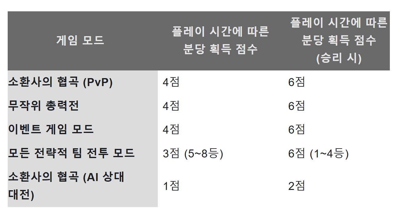 승리 시 분당 최대 6점(롤드컵 시즌 한정으로 사전 팀원 구성시 여기서 +30%)