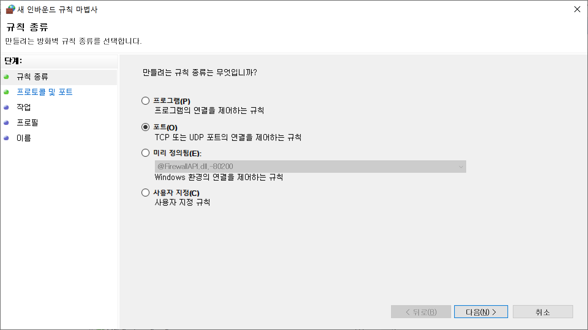규칙 종류에서 포트를 선택합니다.