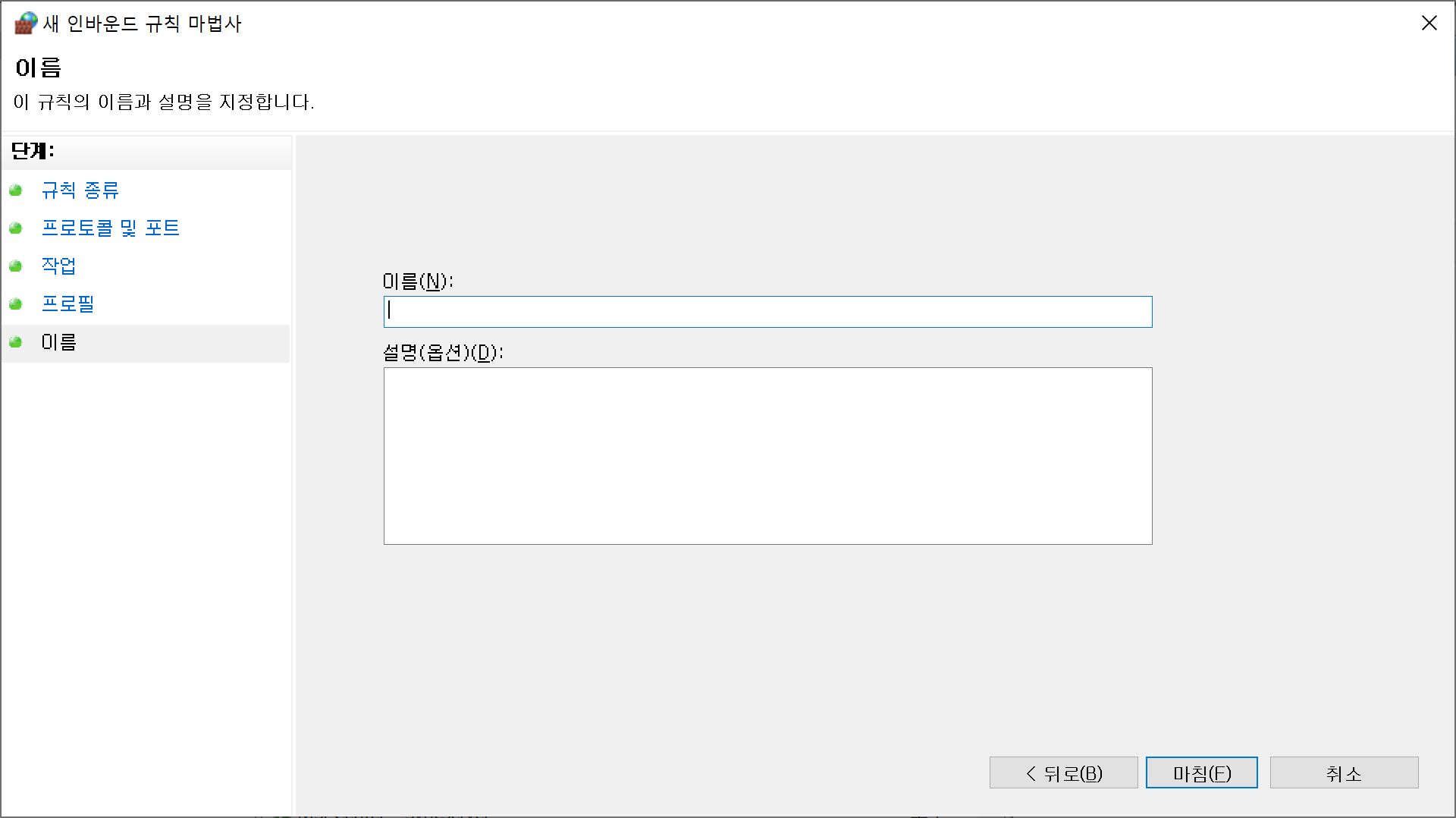 마지막으로 이름을 입력하고 마침을 눌러 방화벽 규칙 추가를 완료합니다.