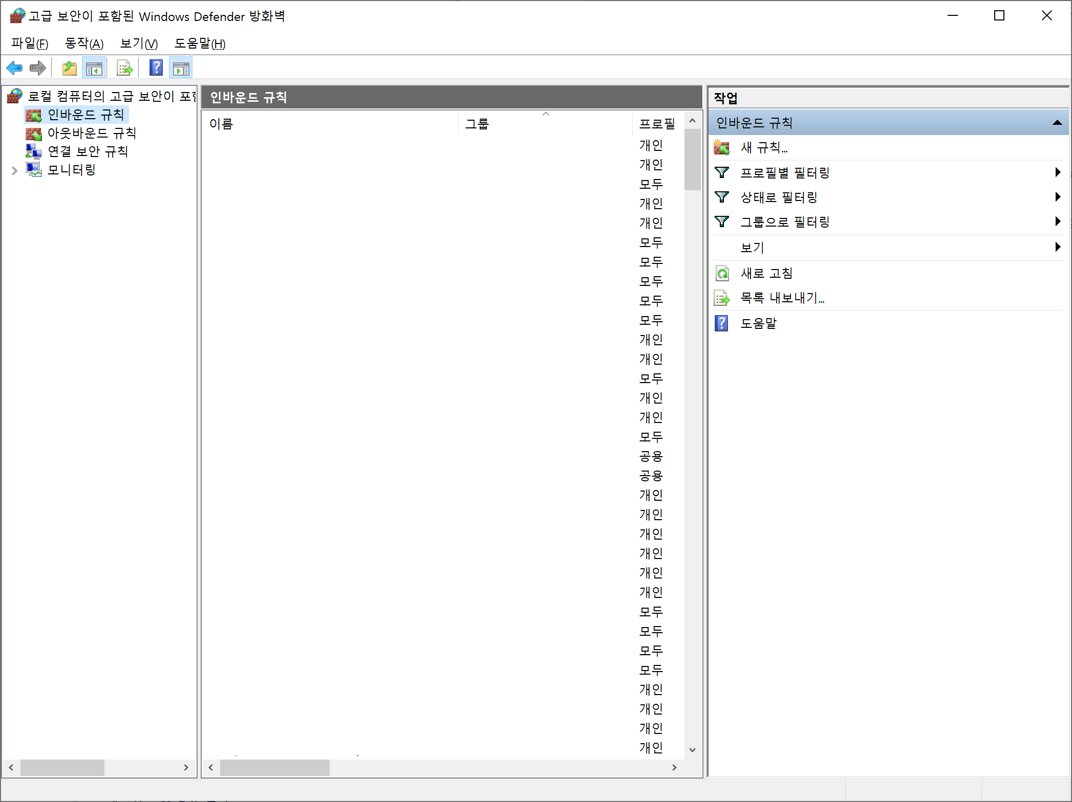 그러면 고급 보안이 포함된 Windows Defender 방화벽 창이 나옵니다.