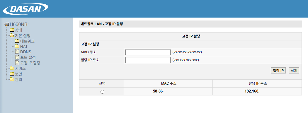 이것을 방지하기 위해 고정 IP를 설정할 수 있습니다. "기본 설정 - 고정 IP 할당" 페이지에서 iptime의 mac 주소와 할당할 ip 주소를 설정하면 됩니다. 테이블 정보에서 사용되지 않은 IP 주소를 설정하면 되며, 이미 iptime에 할당된 주소를 설정해도 됩니다.