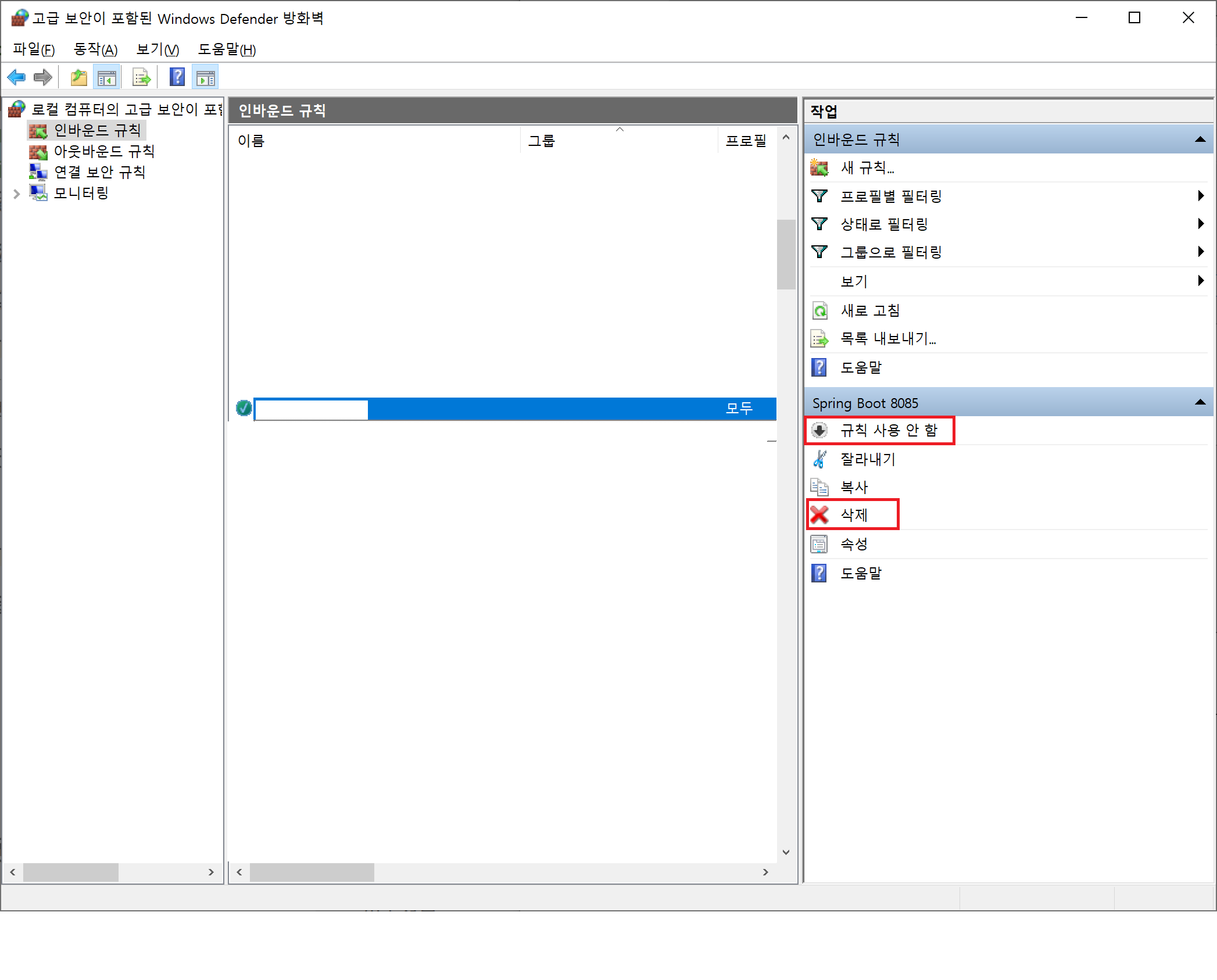 추가한 방화벽 설정을 취소하려면, 규칙을 선택한 후 우측 메뉴에서 규칙 사용 안함 또는 삭제를 선택하면 됩니다.