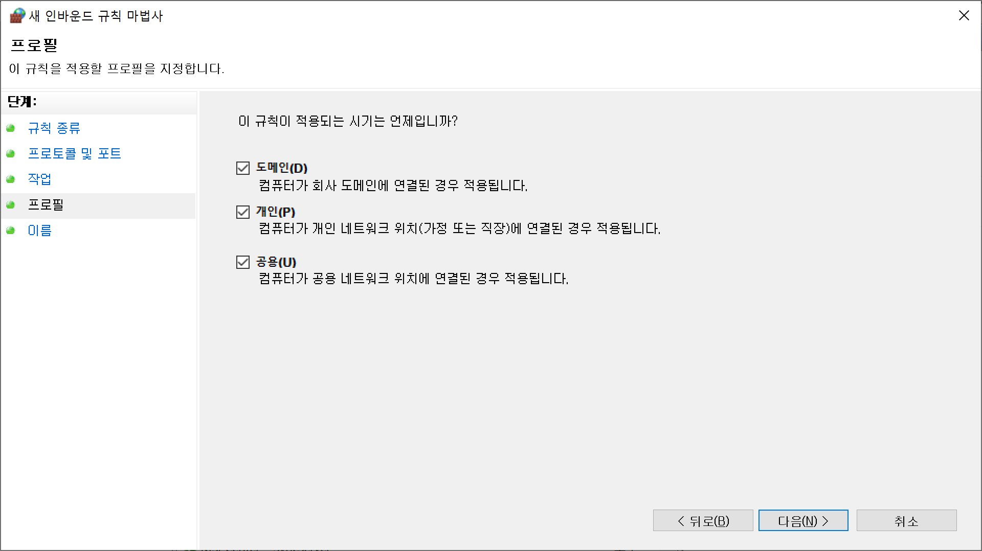 도메인, 개인, 공용 중 상황에 맞는 항목을 선택합니다.