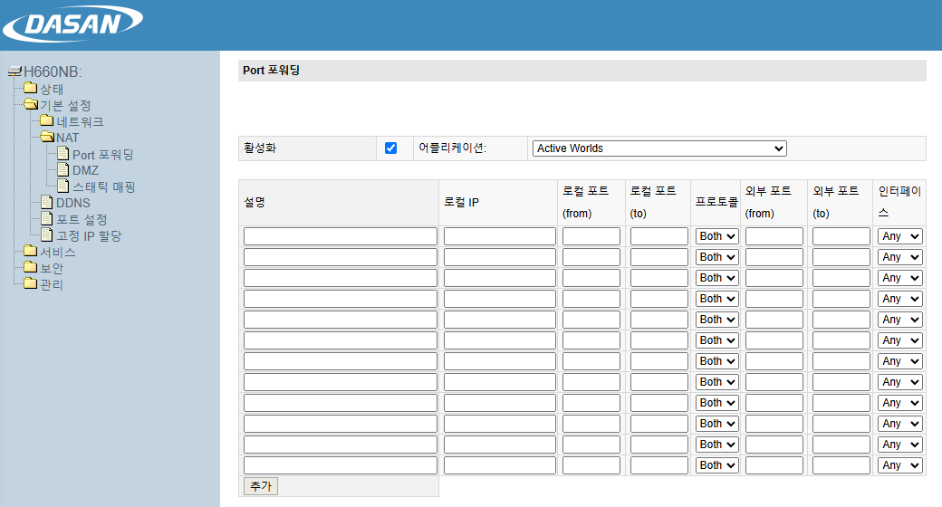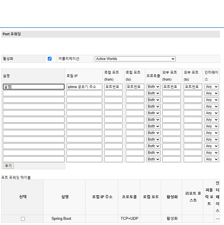 모든 항목들을 입력한 후 왼쪽 아래 추가 버튼을 누르면 하단 포트 포워딩 테이블에 설정한 내용이 추가됩니다.