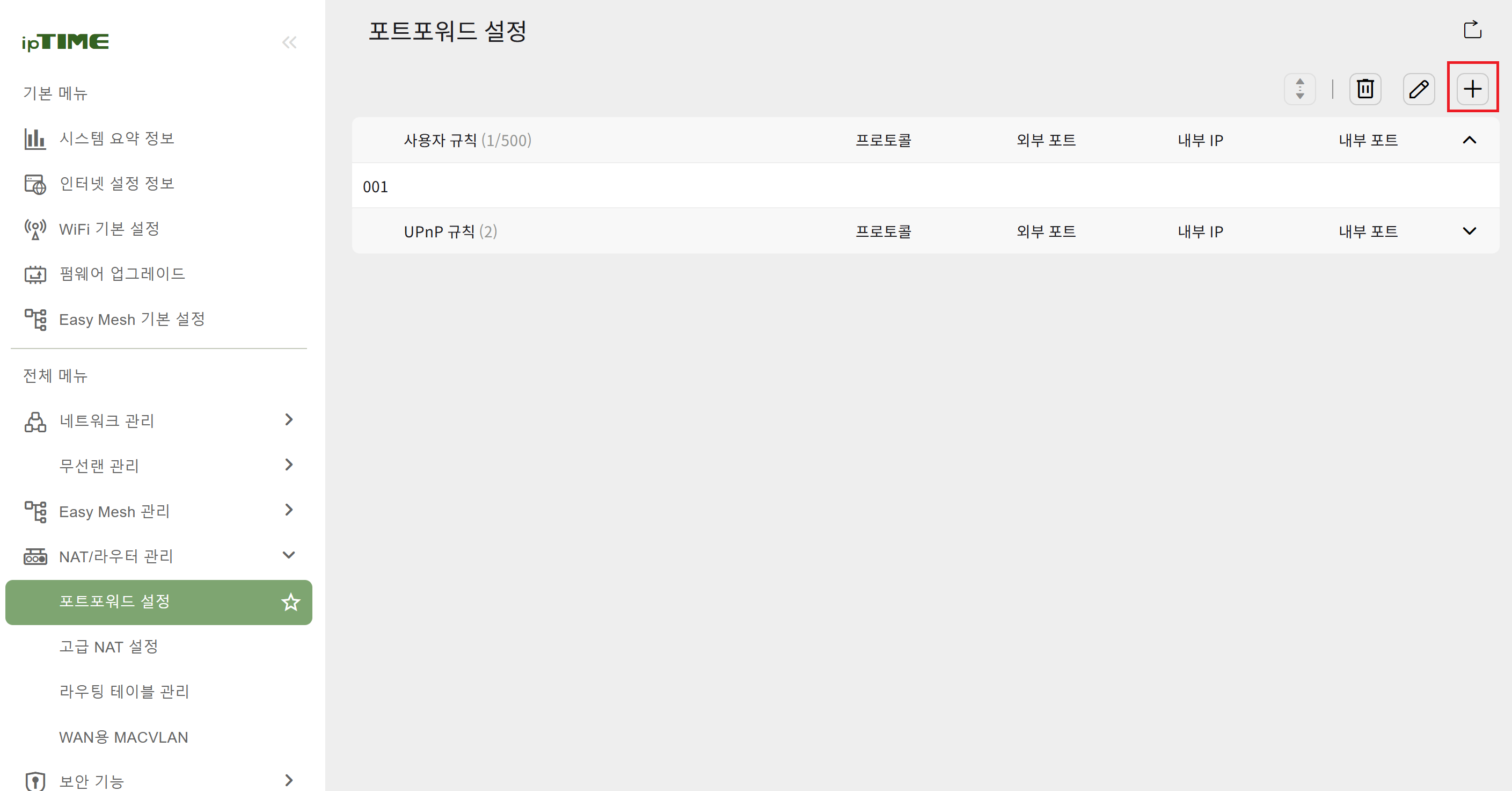 iptime 공유기 관리페이지인 192.168.0.1로 접속한 후, NAT/라우터 관리 - 포트포워드 설정 페이지로 이동합니다.