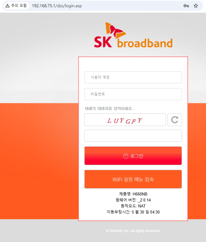 SK 모뎀 관리 페이지에 접속하려면 브라우저 주소창에 192.168.75.1을 입력합니다.