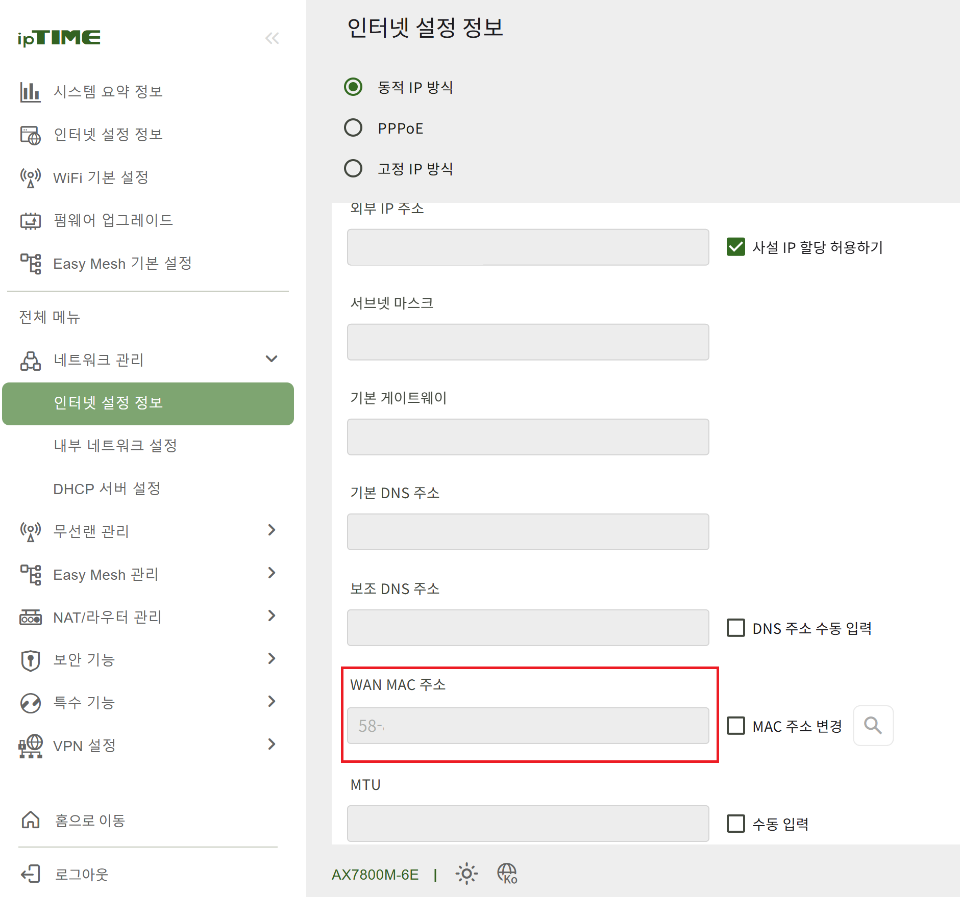 그러면 하단에 WAN MAC 주소 항목에서 iptime 공유기의 mac 주소를 확인할 수 있습니다.