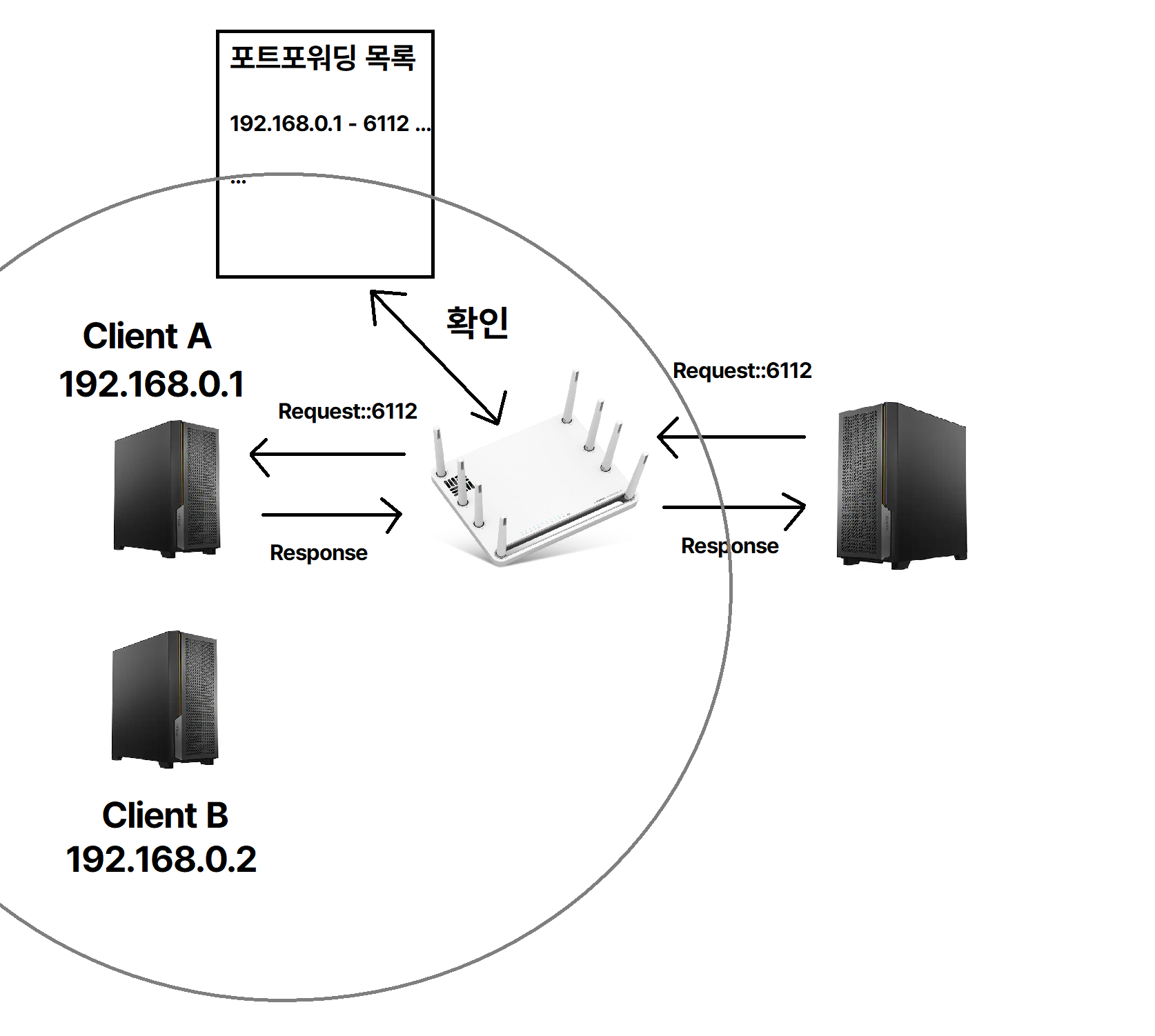 포트포워딩은 공유기(NAT 장비)가 외부에서 특정 포트로 들어오는 요청을, 내부 네트워크의 특정 IP 주소와 포트로 전달하도록 설정하는 것을 의미합니다. 예를 들어, 외부에서 공유기의 3000번 포트로 들어온 요청을 내부의 192.168.0.10:3000으로 전달할 수 있도록 설정하는 방식입니다.