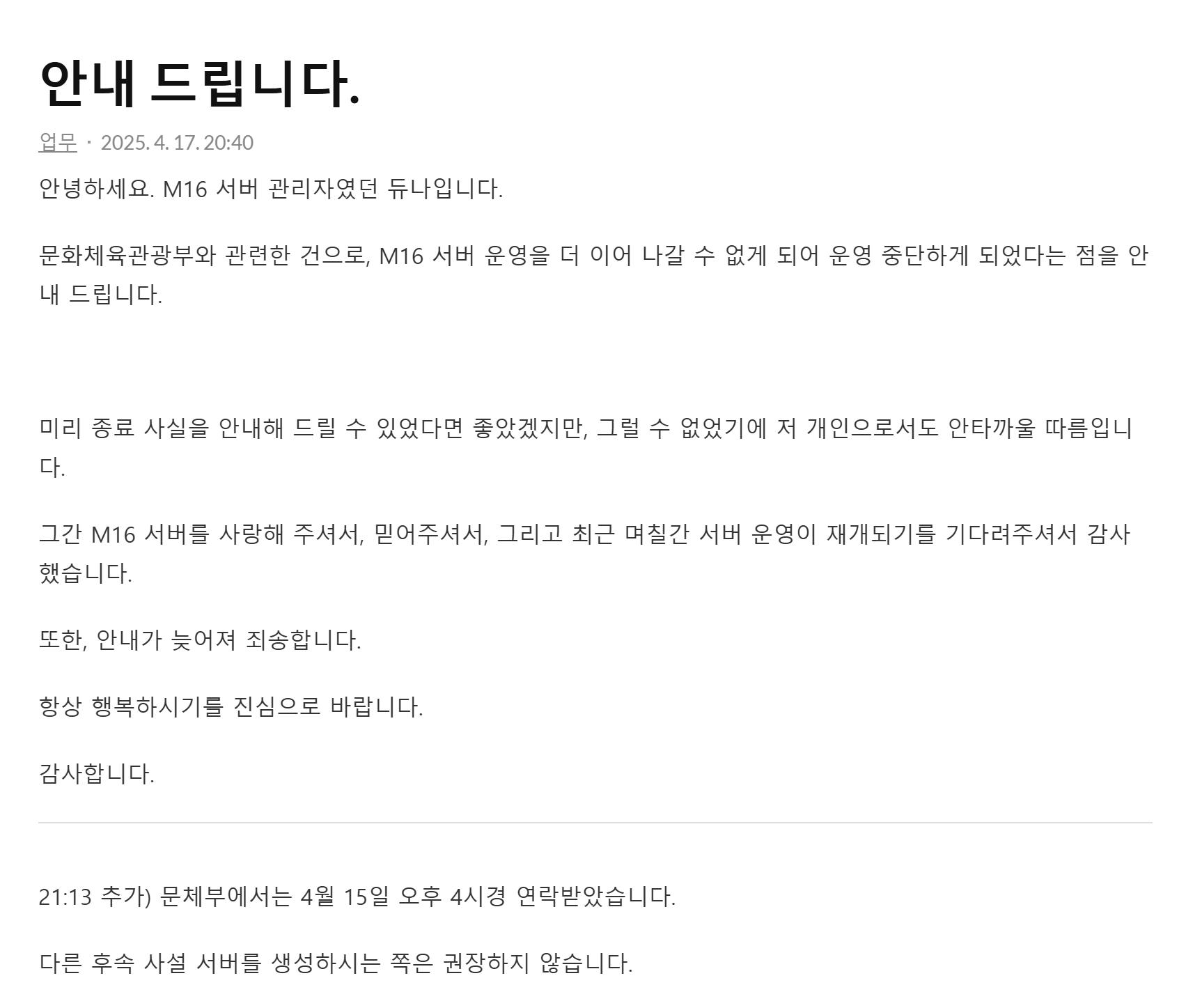 스타크래프트의 사설 서버인 피시서버는 이미 종료된 지 꽤 됐고, 워크래프트3의 사설 서버인 m16 서버도 지난주 종료 소식을 전했습니다.