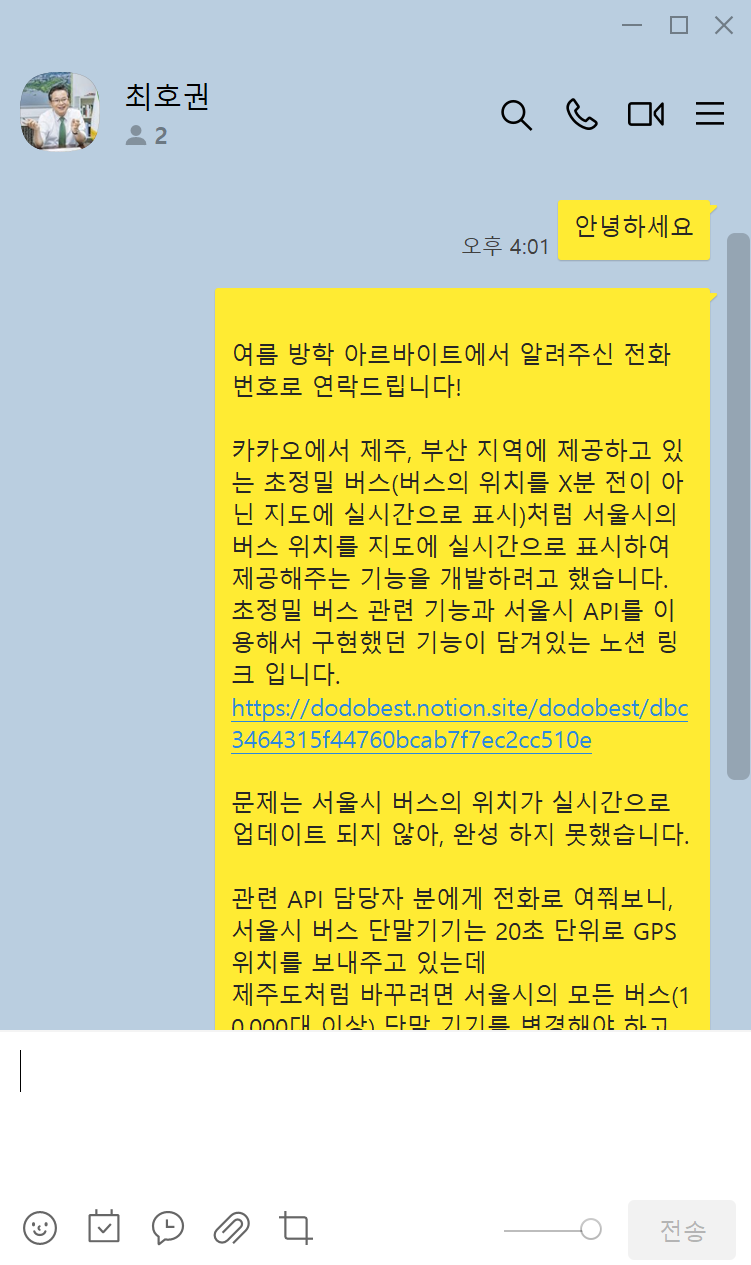 아르바이트 마지막 주에 구청장님과의 대화 시간이 있었고, 끝날 무렵 구청장님이 전화번호를 알려주시고 건의할 내용이 있으면 카톡을 보내도 된다고 하셨습니다. 그래서 위 버스 단말 기기 관련 내용을 구청장님께 카톡으로 건의드렸습니다. 하지만 읽고 답변이 없으십니다😅 개인 전화번호라고 하셨는데, 업무용 전화번호인가 봅니다. 주말에 답변을 해주셨습니다.