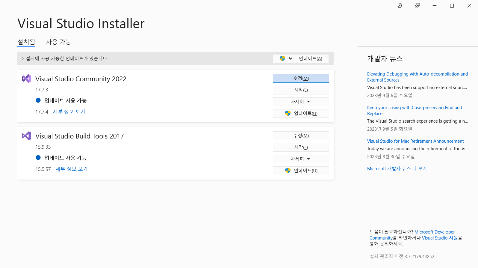 Visual Studio Installer를 실행합니다.
