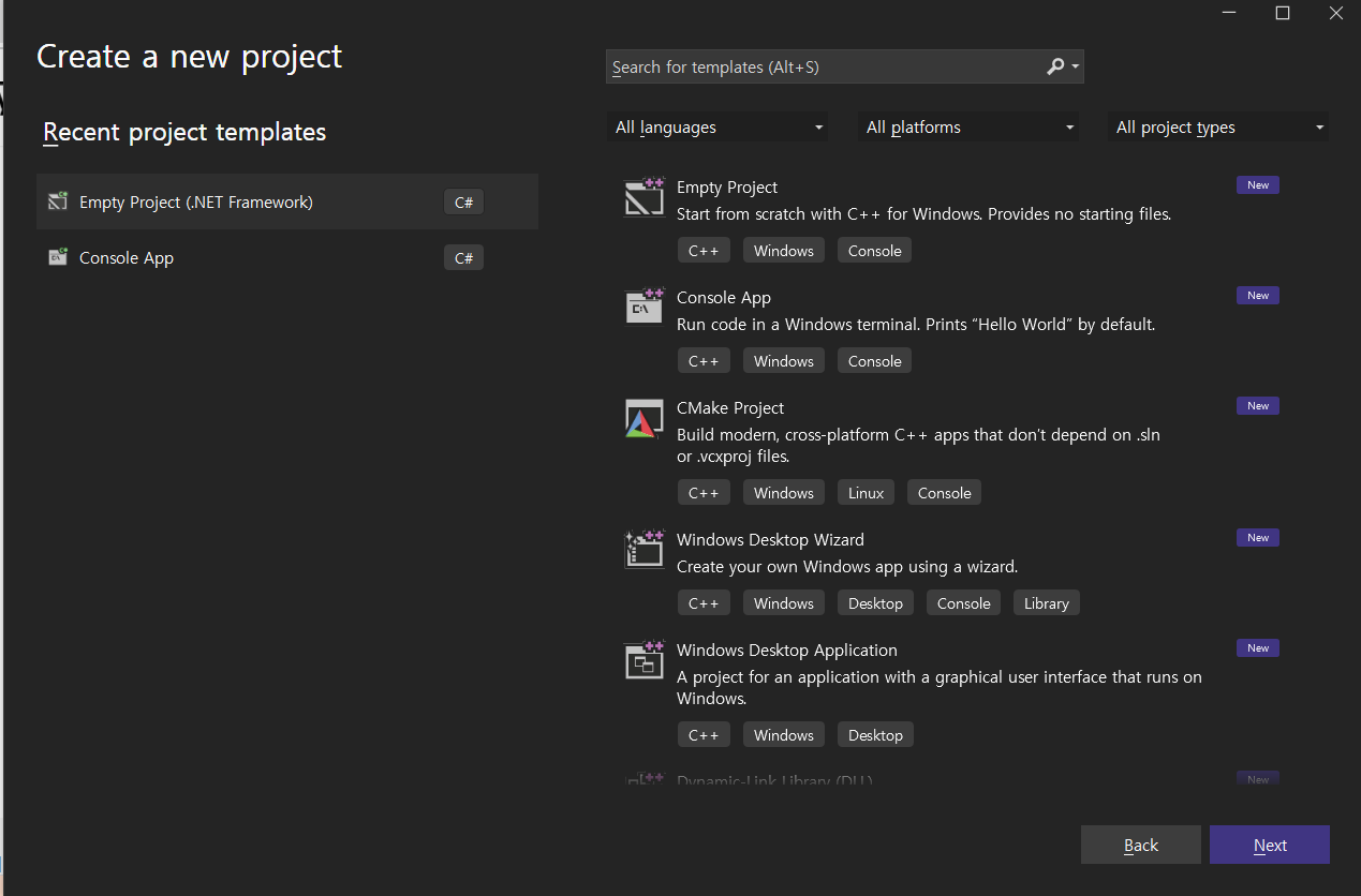 비주얼 스튜디오 2022 에서 새로운 프로젝트를 생성할 때, C++ 빈 프로젝트 탬플릿이 보이지 않는 경우가 있습니다.