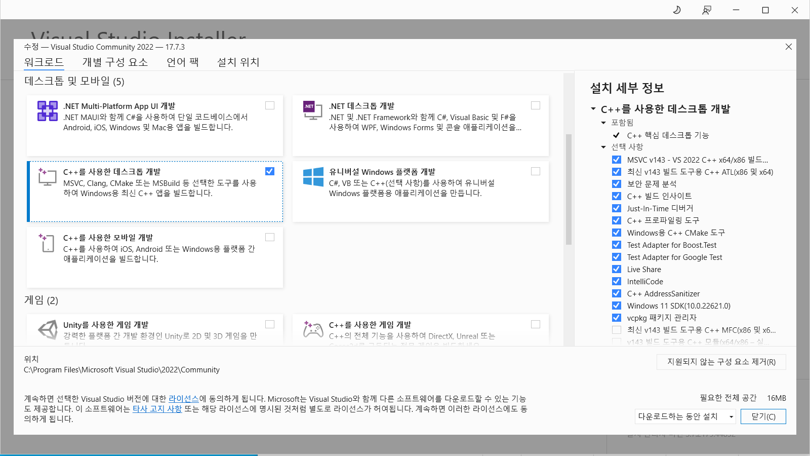 C++를 사용한 데스크톱 개발을 선택 후 설치합니다.