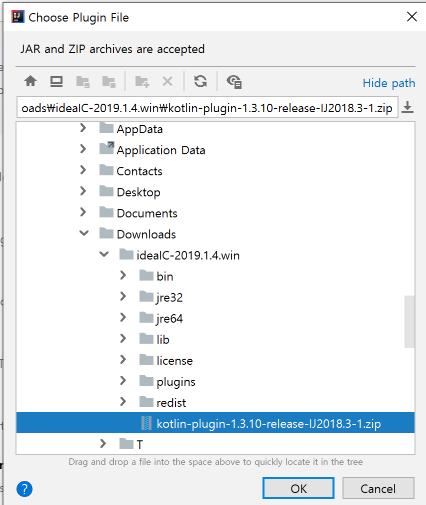 1번에서 다운받은 코틀린 플러그인 zip 폴더를 선택하고 OK를 눌러주세요.