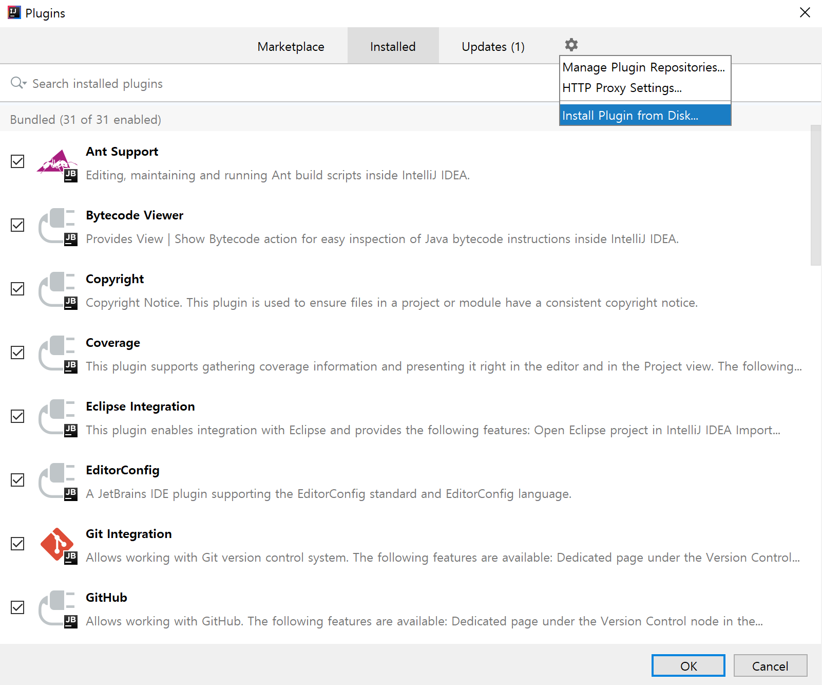 Plugins 화면에서 톱니바퀴 - Install Plugin from Disk를 선택해주세요.
