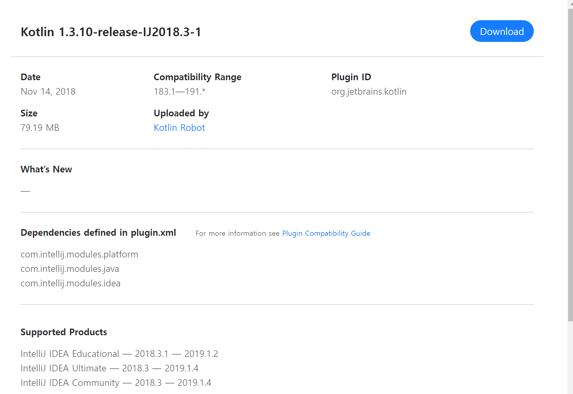 코틀린 1.3.10 플러그인은 IntelliJ 2018.3 ~ 2019.1.4 버전만 지원합니다.