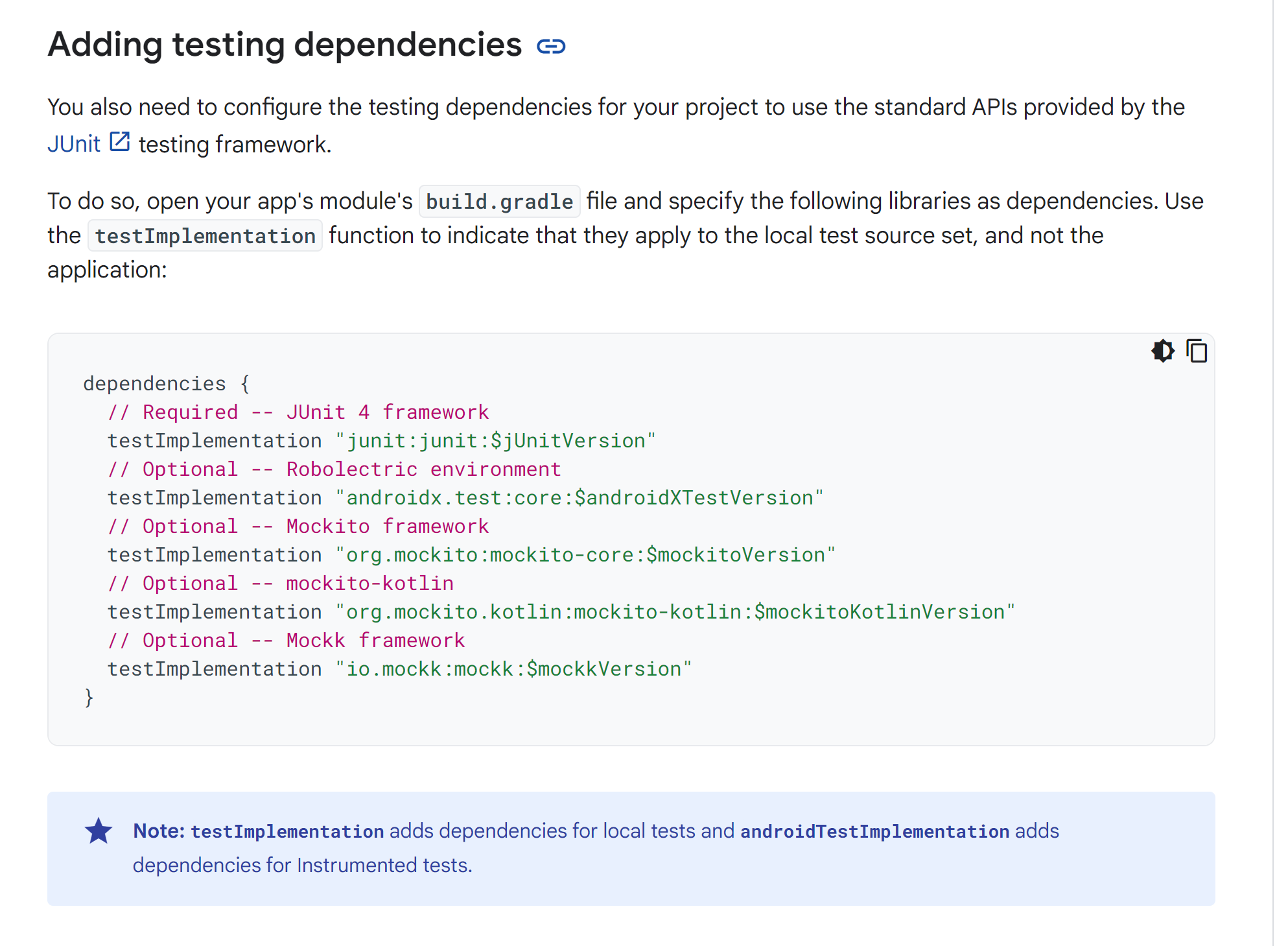 Android 공식 문서에서는 기본적으로 JUnit 4를 이용한 방법을 소개하고 있다.