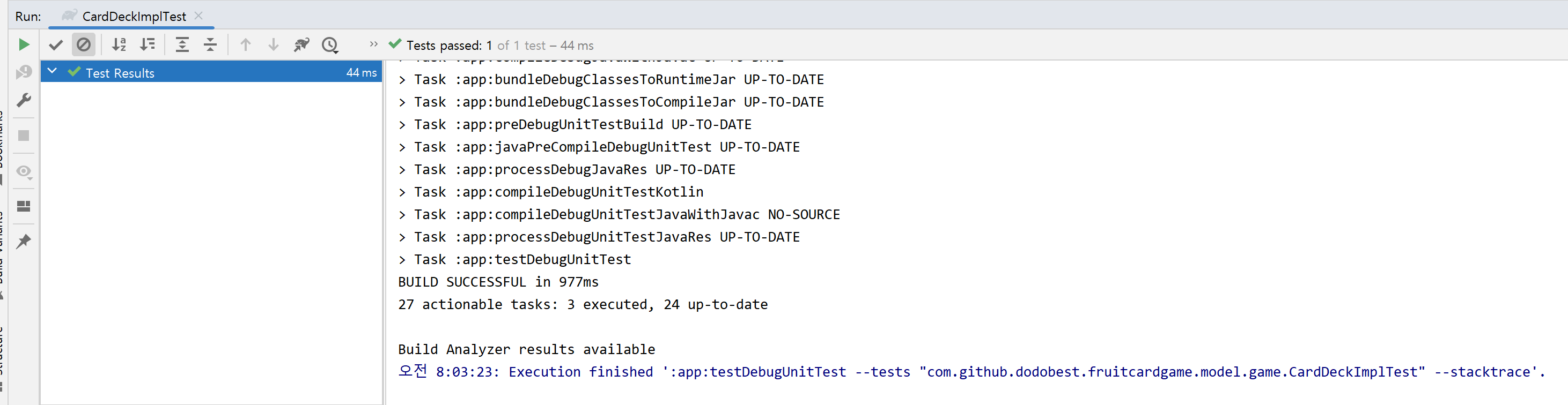 Caused by: org.gradle.api.tasks.testing.TestExecutionException: No tests found for given includes: [com.github.dodobest.fruitcardgame.model.game.CardDeckImplTest](--tests filter)