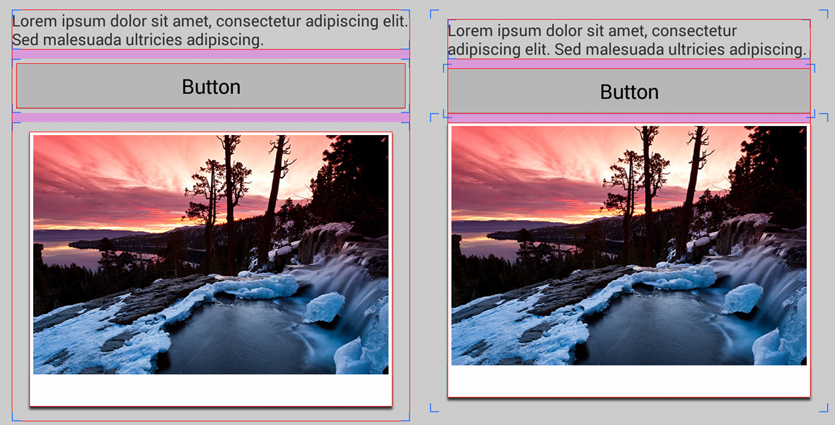 오른쪽은 optical bound(LAYOUT_MODE_OPTICAL_BOUNDS)가 적용된 ViewGroup을 보여준다. optical bound는 View가 차지하는 영역와 완전히 일치하도록 변경되었다.