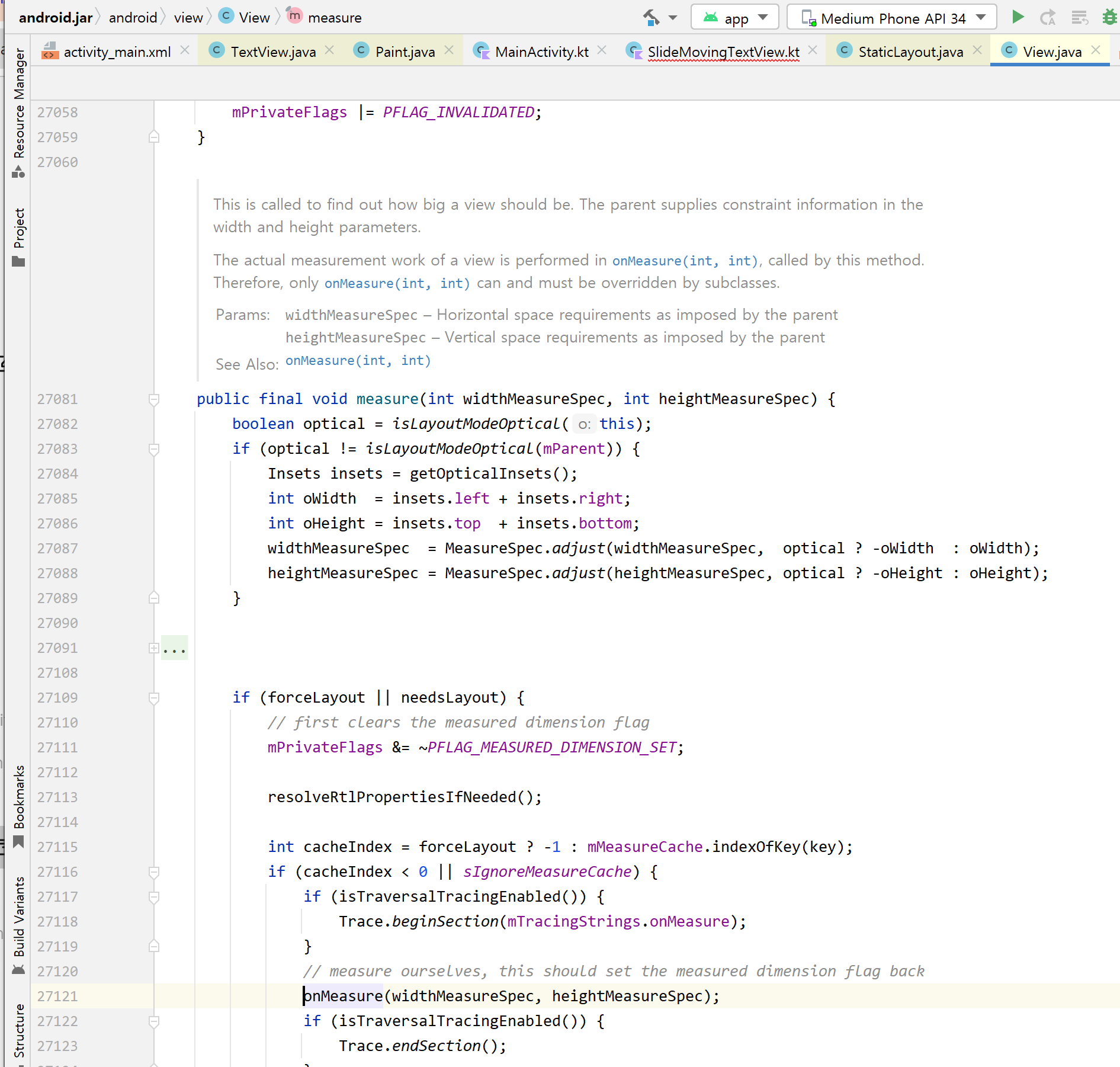 27121 줄을 보면 onMeasure 함수를 호출하는 것을 볼 수 있다.