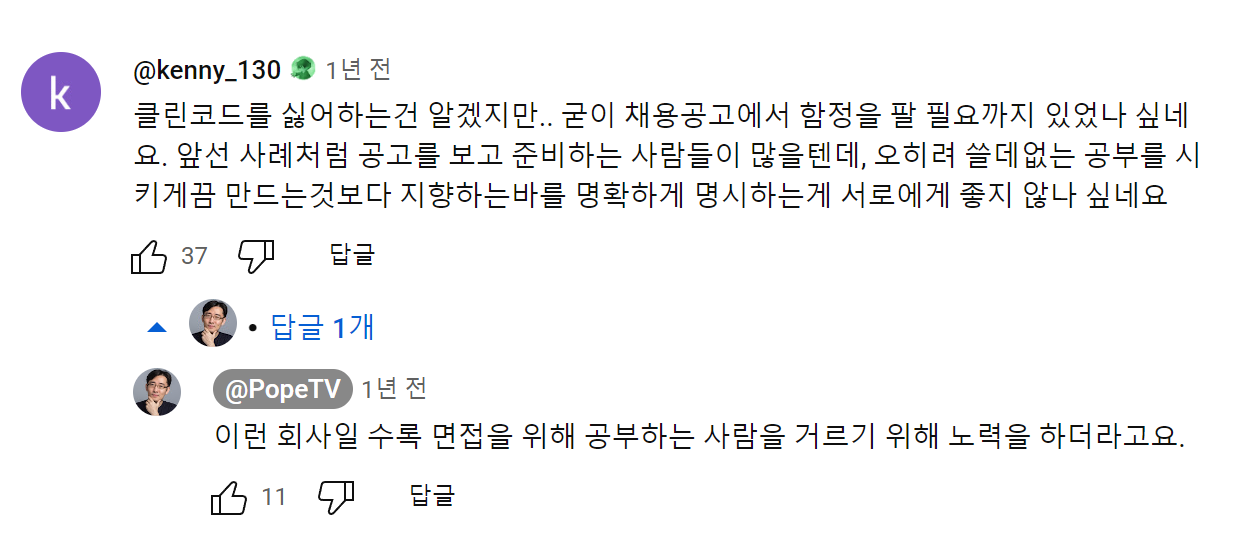 단순히 클린 코드 책 내용만 알고, 그것만 따라하려는 사람은 팀 분위기를 망칠 수 있기에, 공고에는 명시하지 않지만, 면접에서는 이렇게 판단하는 경우도 있다고 한다.