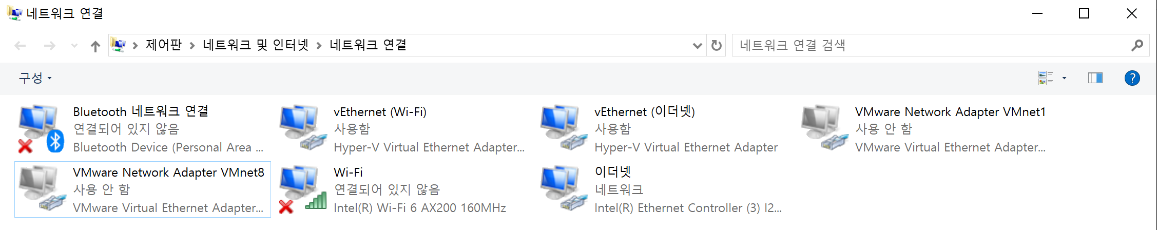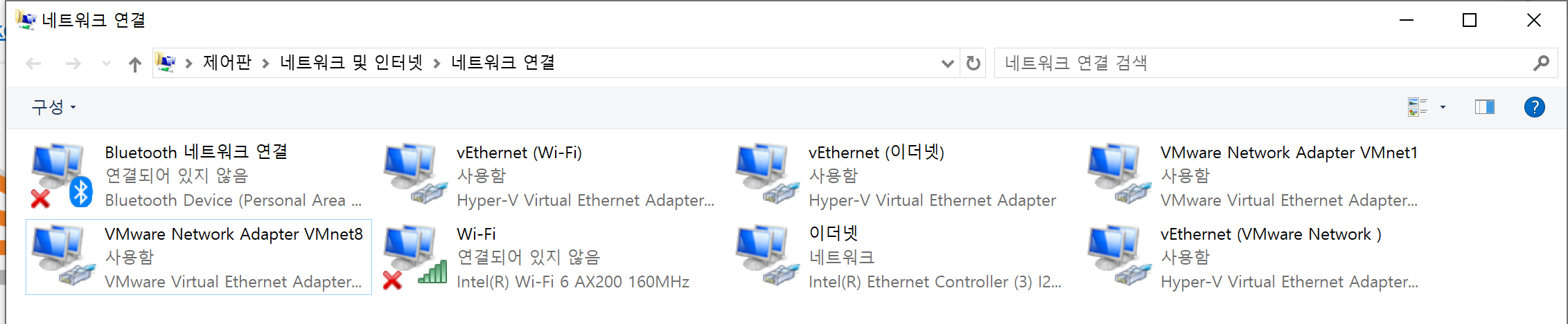 네트워크 연결에 들어가보니, VMWARE 관련 네트워크가 많이 있었다.