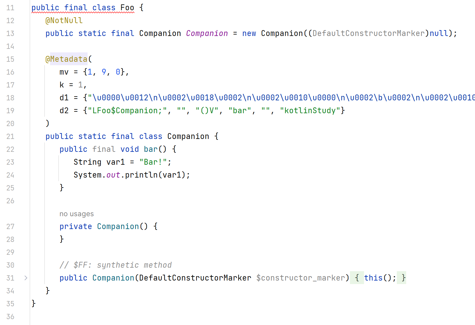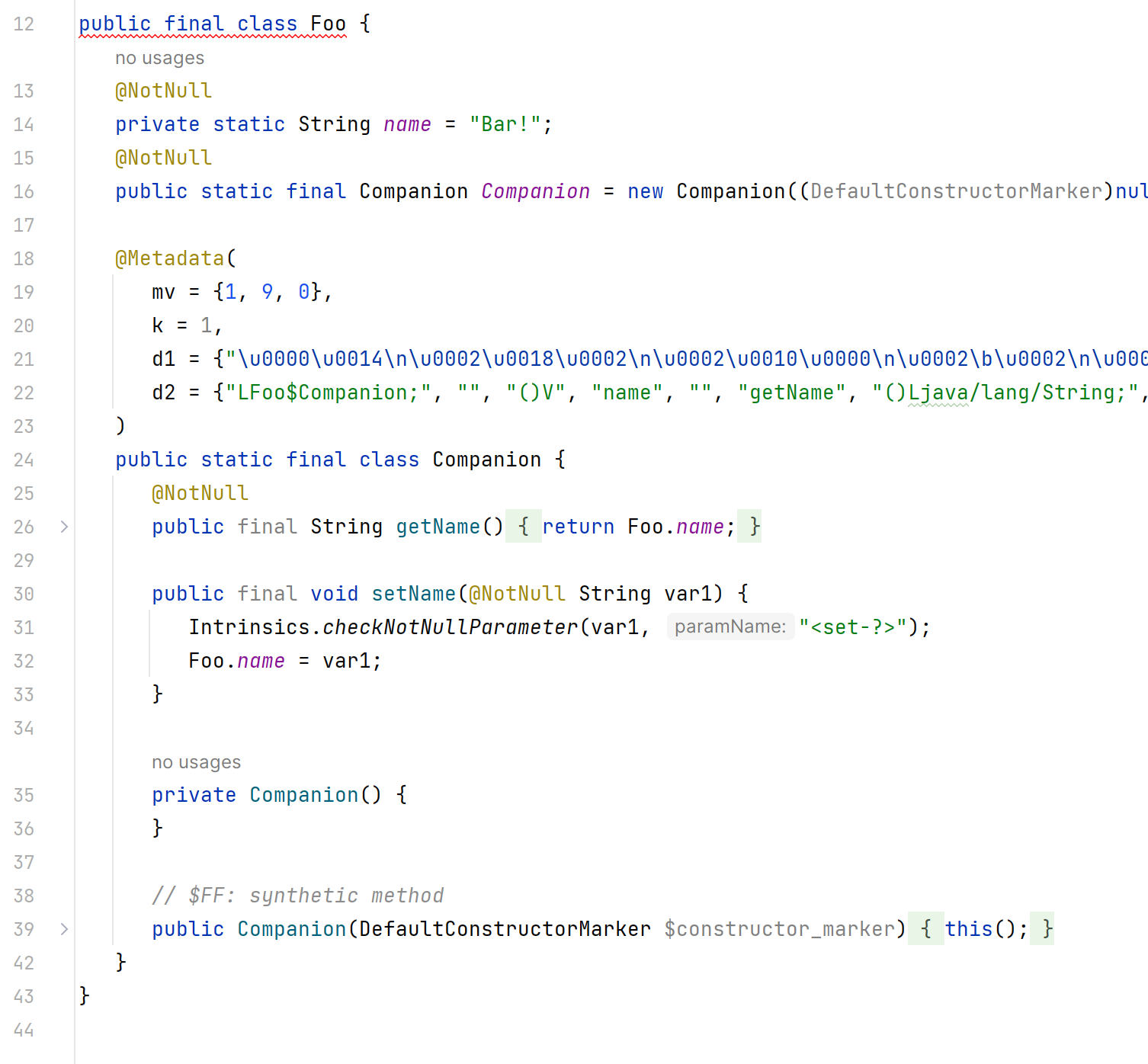 또한 const가 붙은 값은 companion object가 아닌 Foo 클래스의 static 멤버 변수로 선언됩니다.
