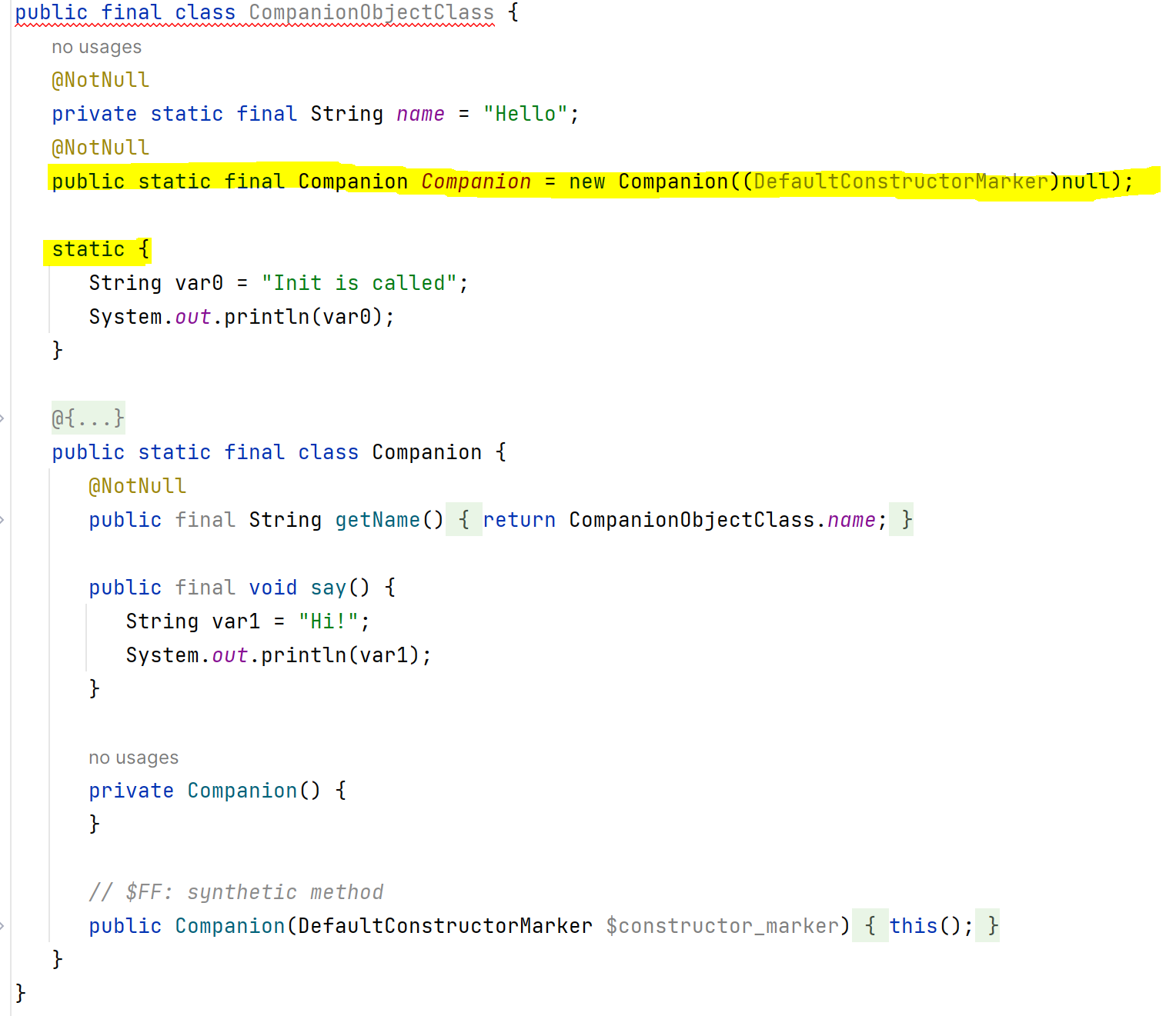 companion object 클래스의 init block은 외부 클래스 내부에 있으며, 인스턴스는 외부 클래스의 static Companion 변수로 있습니다.