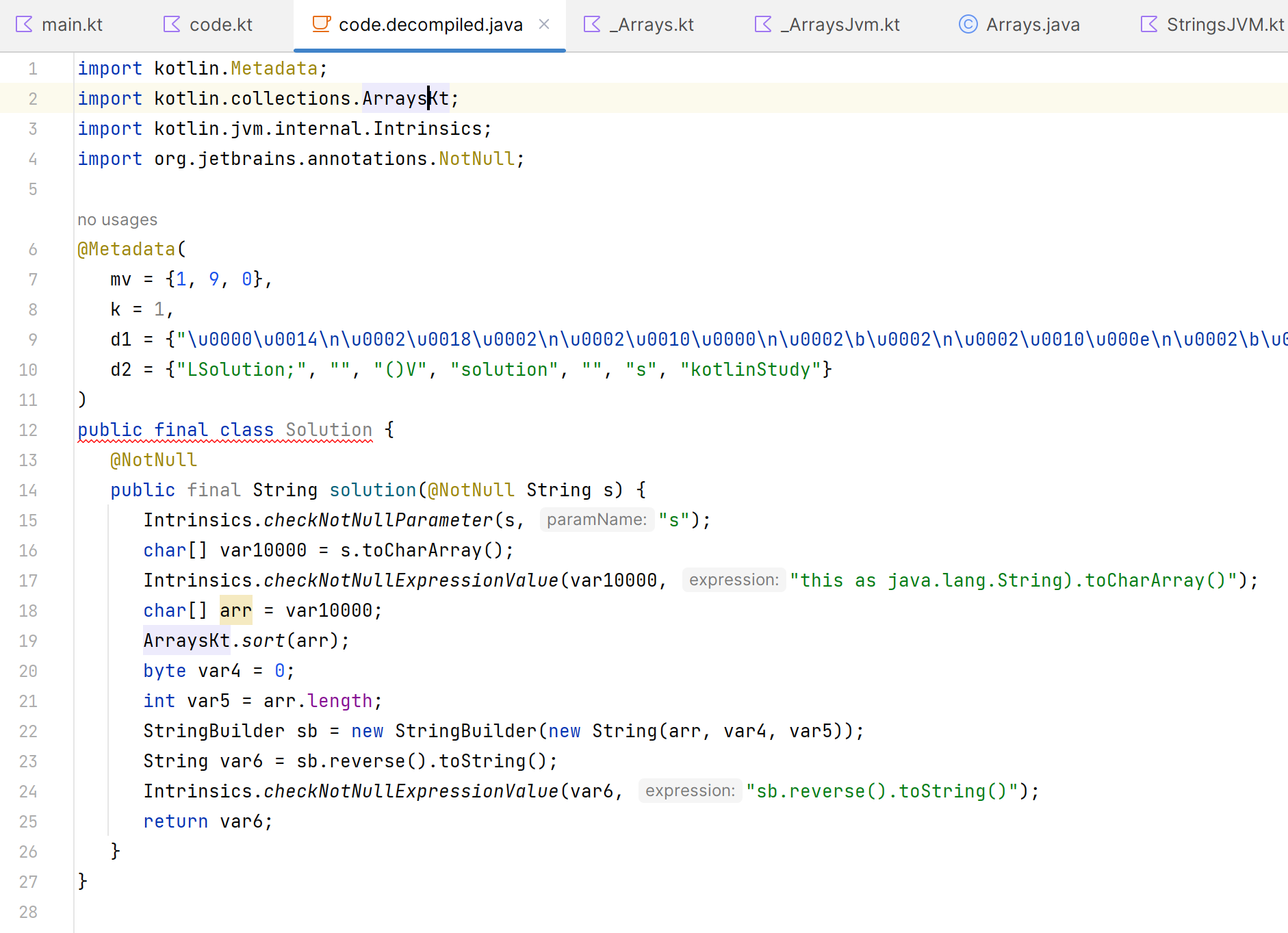 디컴파일된 코드를 확인해보면 arr.sort는 Kotlin의 collection boxing type을 사용하고 있는데, 이 과정에서 오버헤드가 발생하는 것으로 추정된다.