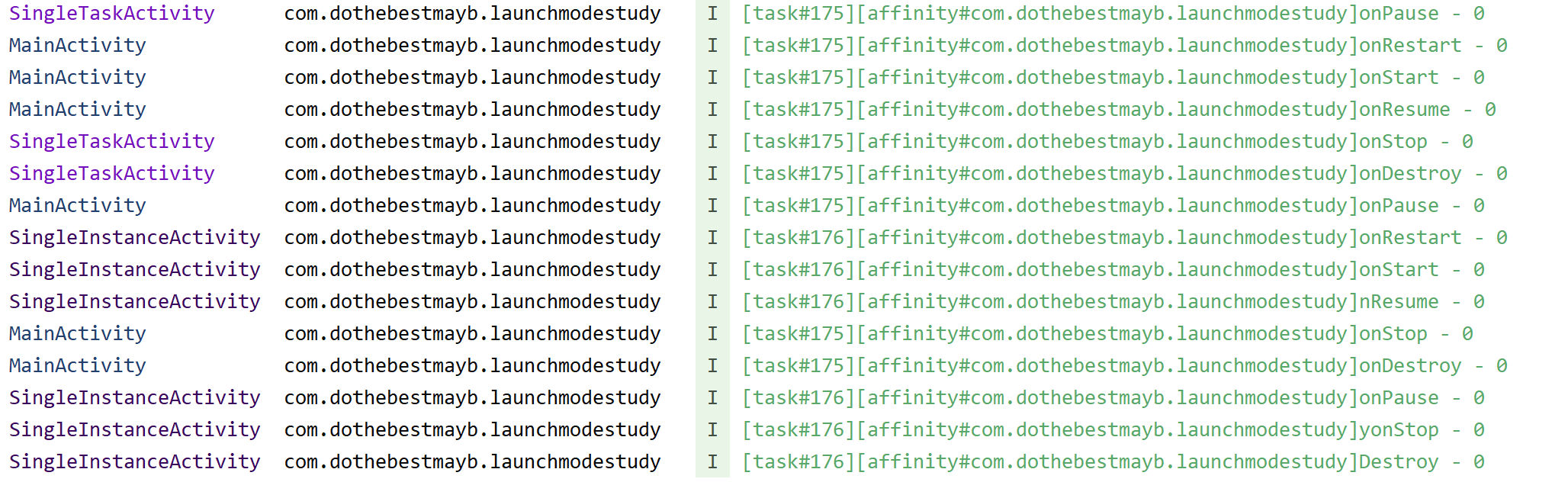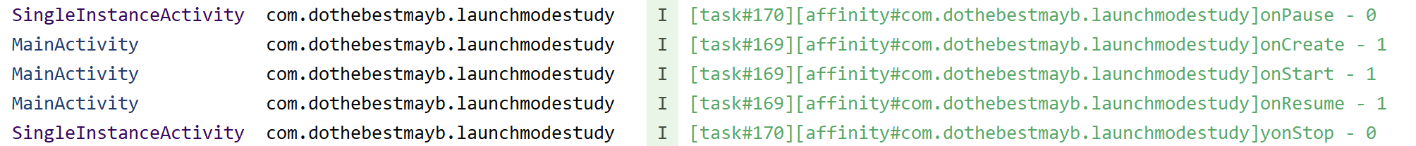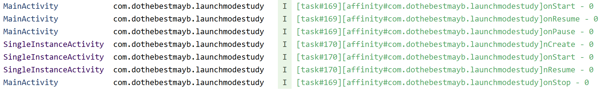 아래 Log는 MainActivity → SingleInstanceActivity를 실행한 결과입니다. 둘은 동일한 Affinity를 가짐에도 별도의 task가 생성됐습니다.