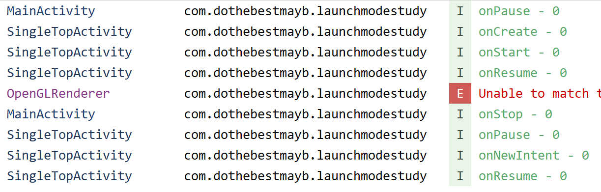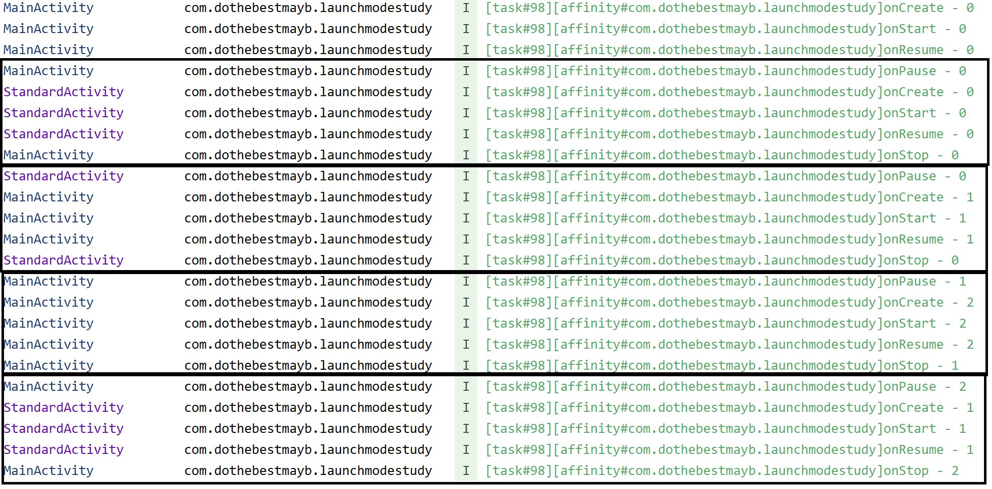 아래 로그는 MainActivity → StandardActivity → StandardActivity(FLAG_ACTIVITY_SINGLE_TOP) 순으로 실행한 결과입니다. Activity가 새로 생성되지 않고 기존의 Activity가 그대로 top에 존재하는 것을 확인할 수 있습니다.