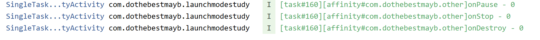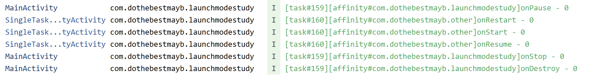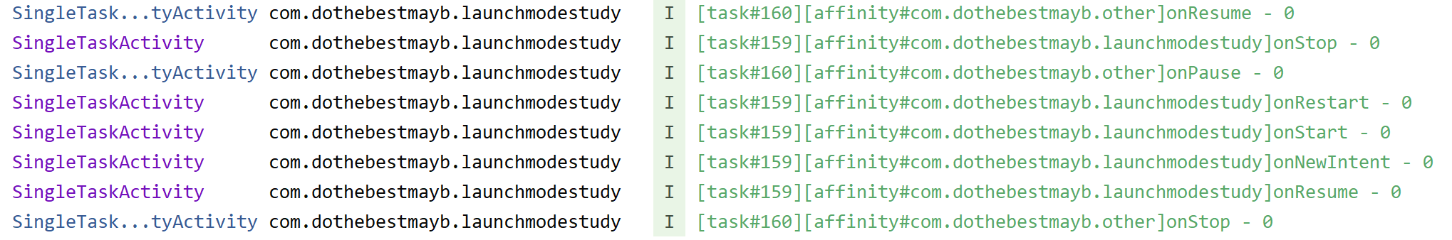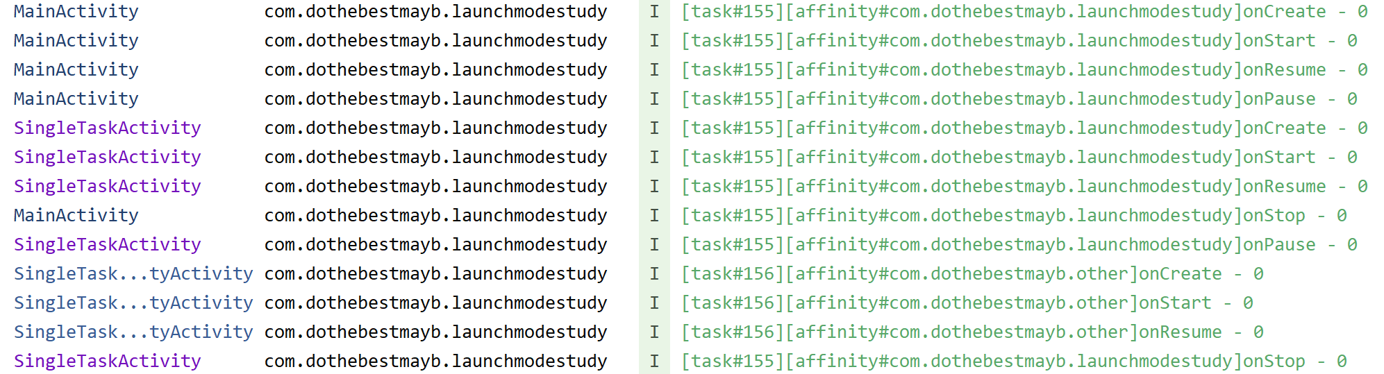 아래 로그는 MainActivity → SingleTaskActivity → SingleTaskWithOtherAffinityActivity(STWO) 순으로 실행한 결과입니다.