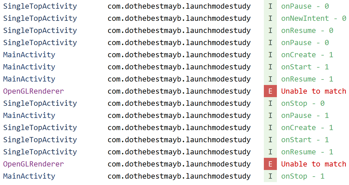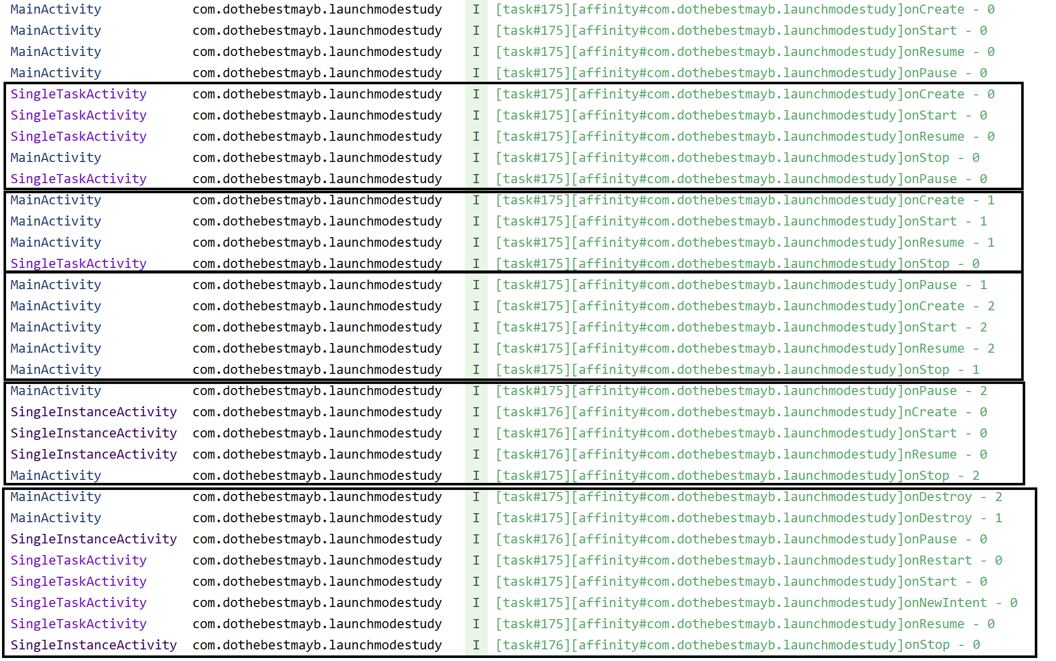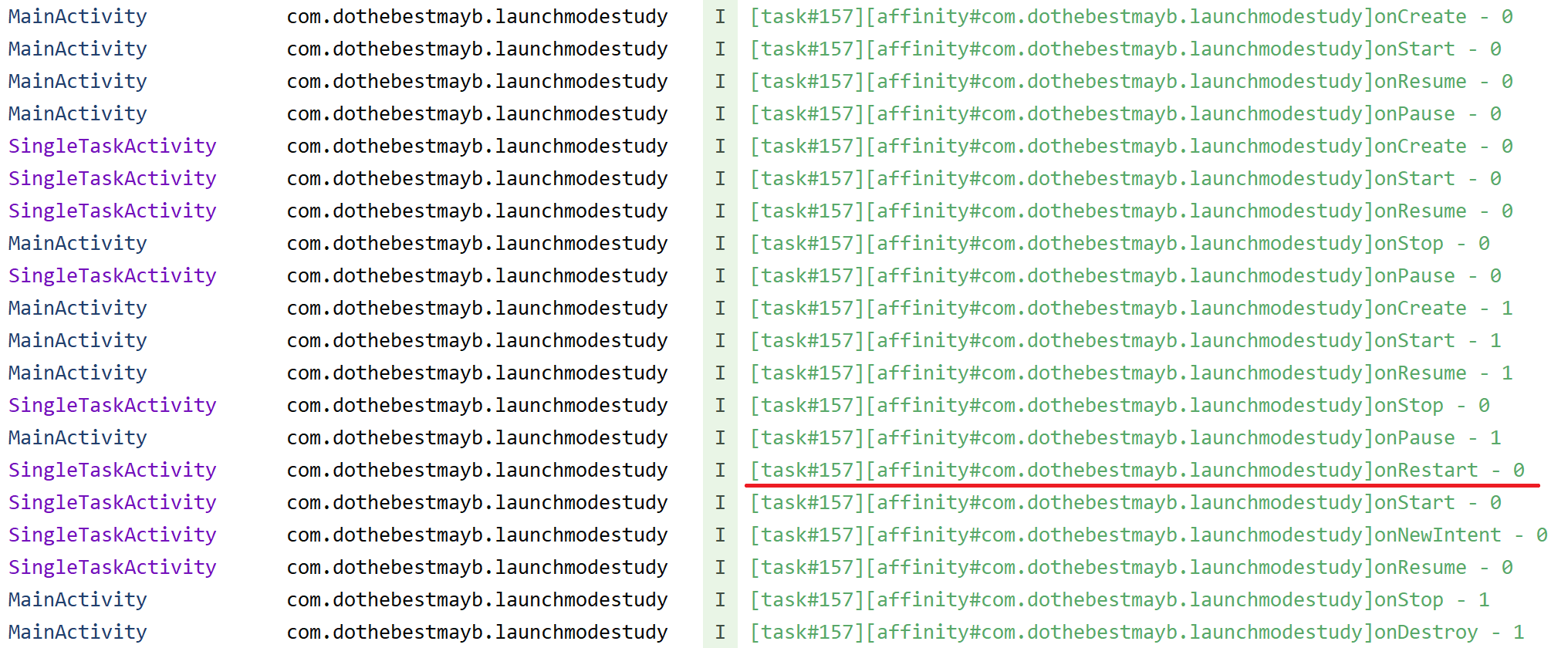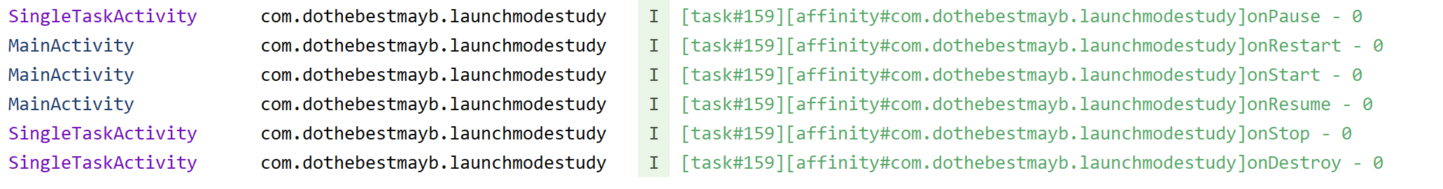아래 로그는 MainActivity → SingleTaskActivity → MainActivity → SingleTaskActivity 순으로 실행한 결과입니다.