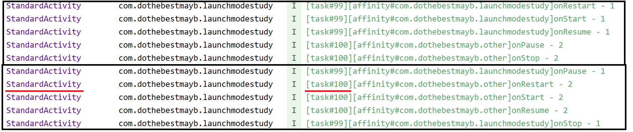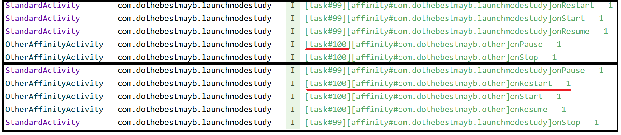아래 로그는 이전 상태에서 Standard Activity를 실행한 후, 최근 앱 목록에서 이전 Task로 전환해서 다시 OtherAffinityActivity를 FLAG_ACTIVITY_NEW_TASK와 함께 실행한 결과입니다. taskAffinity에 해당하는 task로 전환은 됐지만, OtherAffinityActivity가 아닌 해당 task의 top에 존재하는 StandardActivity가 다시 시작된 것을 볼 수 있습니다.