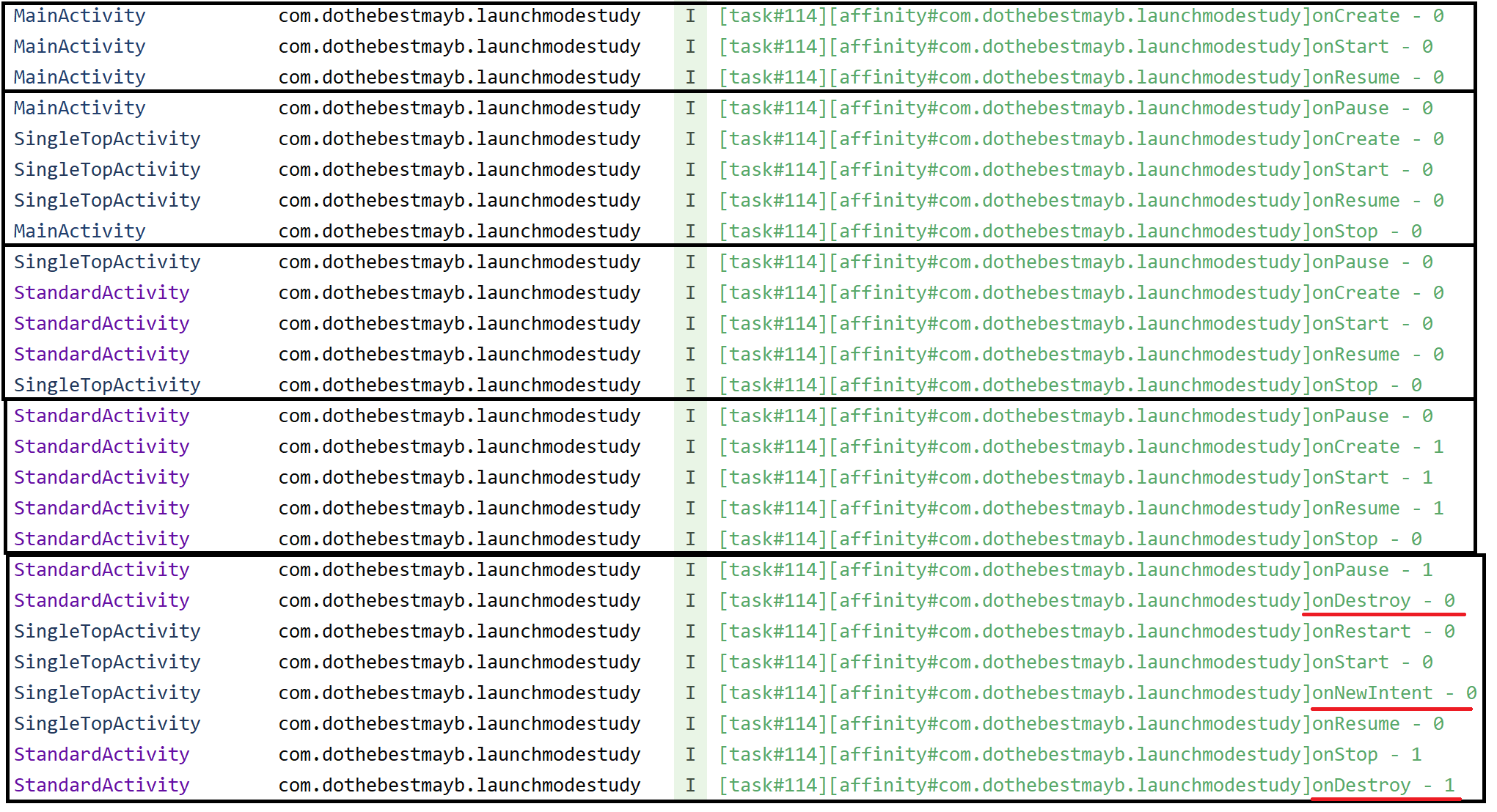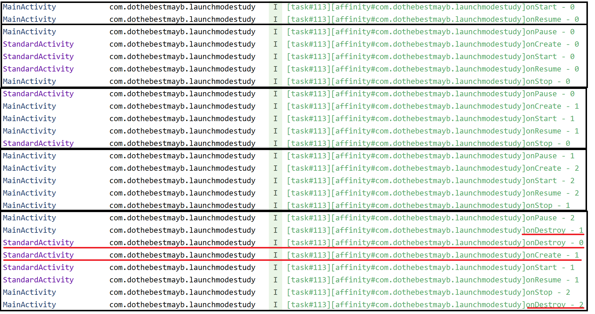 아래 로그는 MainActivity → StandardActivity → MainActivity → MainActivity → StandardActivity(FLAG_ACTVITY_CLEAR_TOP)의 실행 결과입니다.