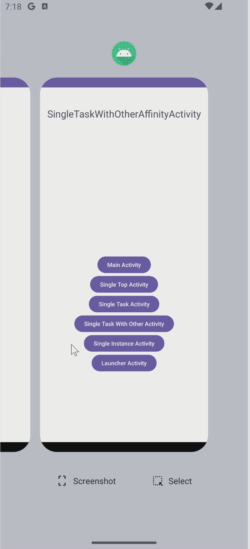 MainActivity → OtherAffinityActivity → Standard Activity → Standard Activity → OtherAffinityActivity(FLAG_ACTICITY_NEW_TASK) → 최근 앱 목록에서 이전 Task의 Standard Activity로 전환 → OtherAffinityActivity(FLAG_ACTICITY_NEW_TASK) → Standard Activity → 최근 앱 목록에서 이전 Task의 Standard Activity로 전환 → OtherAffinityActivity(FLAG_ACTICITY_NEW_TASK)